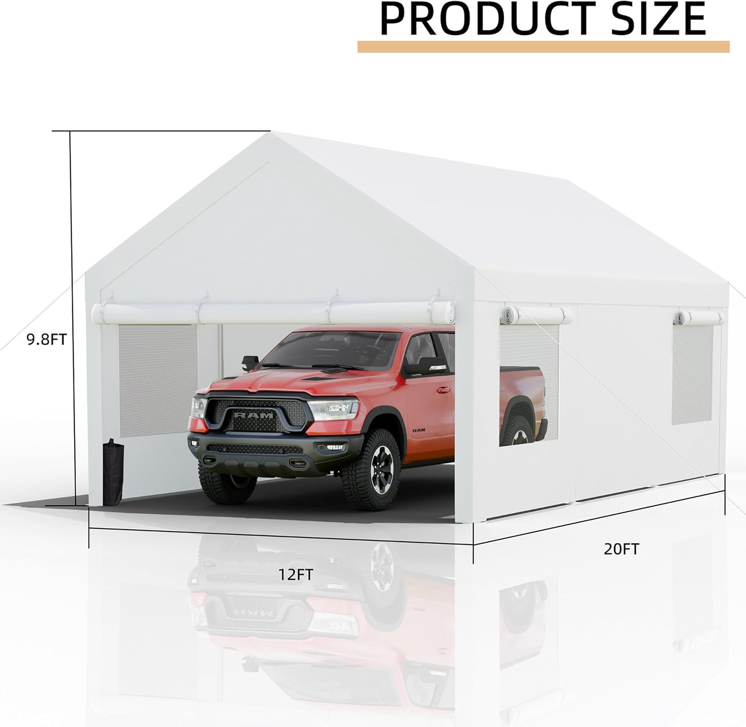JY QAQA Carport, 10x20 FT Heavy Duty Carport with Removable Side Walls and Doors, Portable Garage with Roll-Up Window and Sandbags, Car Canopy with All-Season Tarp for Cars, Trucks, Boats, White