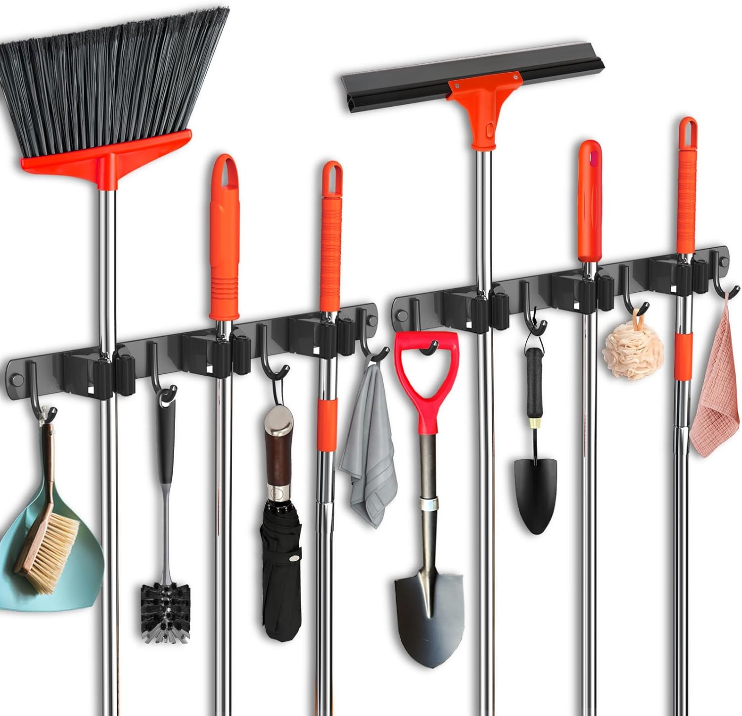 - VERSATILE STORAGE: Each holder features multiple slots and hooks to securely grip handles of different sizes for brooms, mops, rakes, and other tools