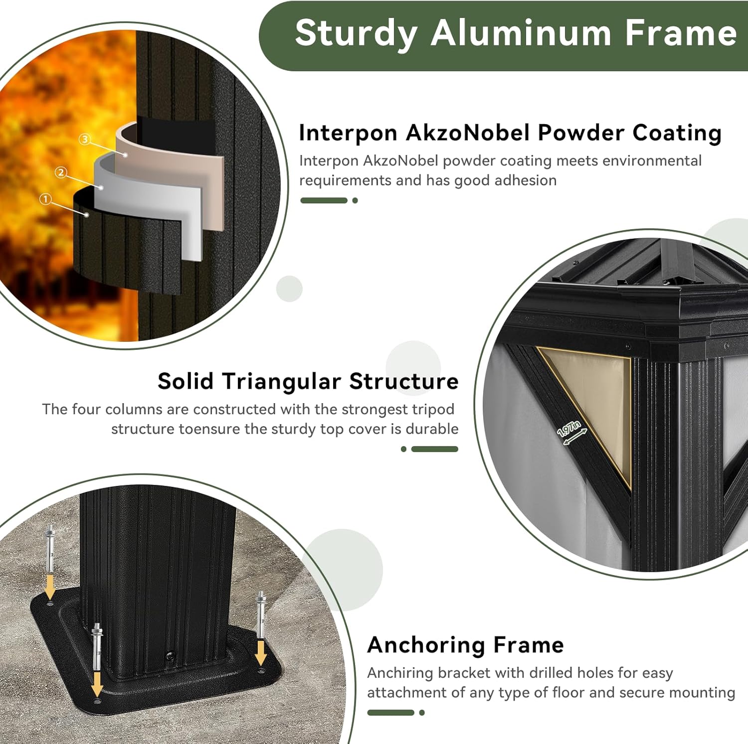 - Galvanized Steel Top and Water Gutter Design:Selection of powder-coated galvanized steel top, this hardtop gazebo is durable and sturdy enough to endure bad weathers. The professional drainage system enables water to flow from the edge of the gazebo top into the pole and the ground, greatly reducing the troubles of rain or snow accumulation