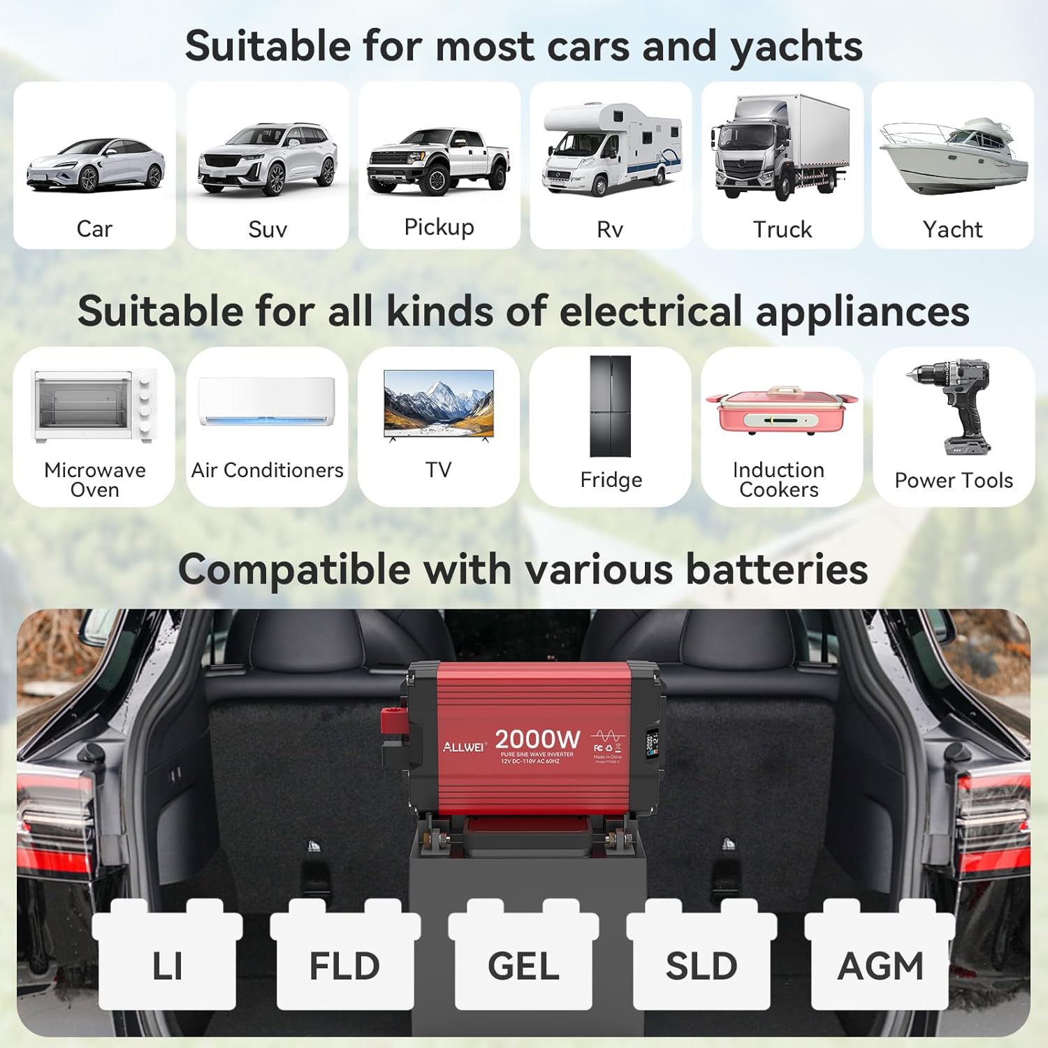 - 【Pure Sine Wave - Device Friendly】: 2000w Pure Sine Wave Inverter provides utility-grade AC power with ultra-low no-load loss, perfect for RVs enthusiasts, truckers, campers; van Life, solar and off-grid setups. It powers sensitive devices (TV, laptop, power tools) and appliances (induction cookers, refrigerators, window air conditioners) smoothly, no annoying humming, protecting equipment and extending lifespan—just like wall outlet electricity