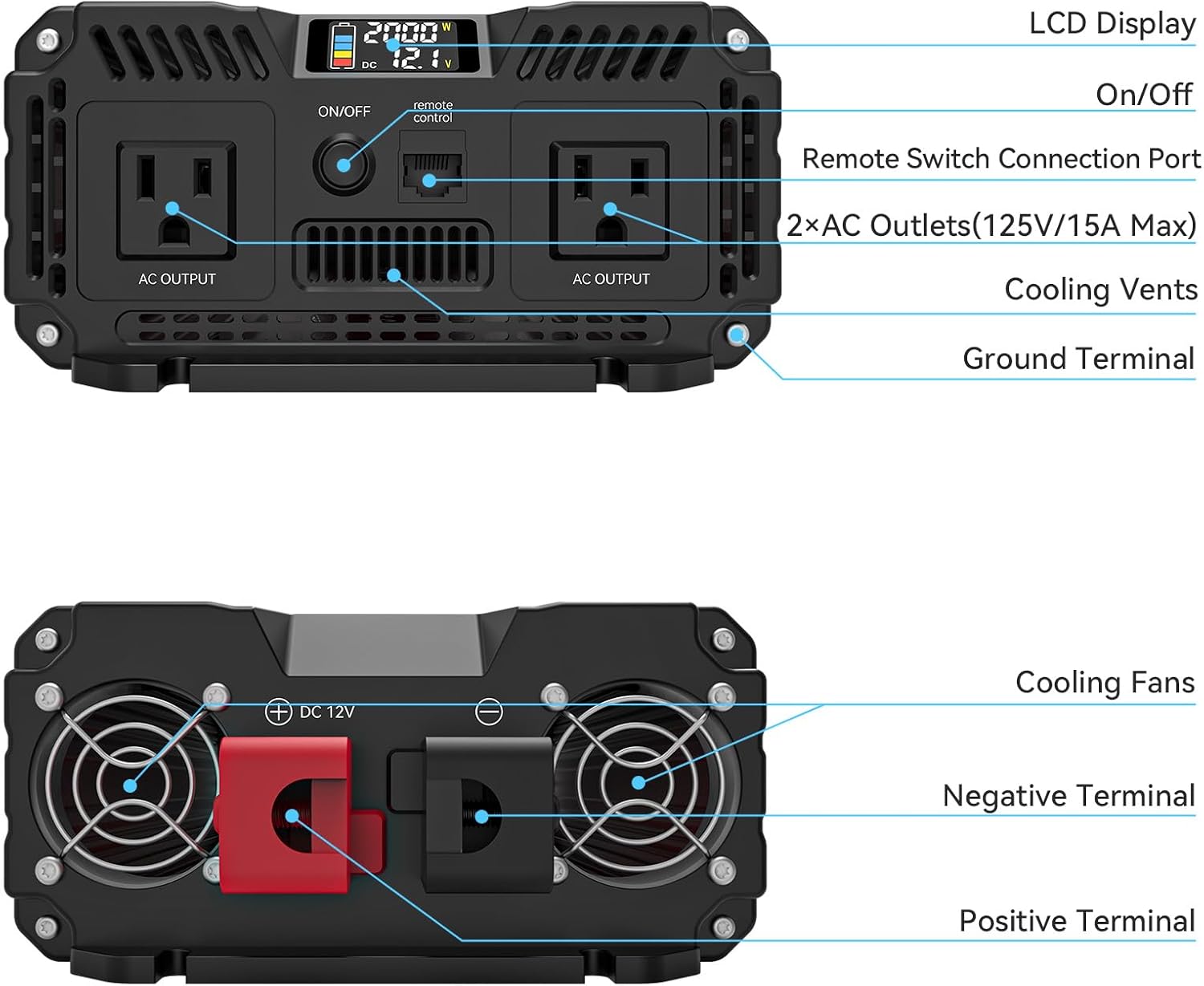 - 【LCD Display & Remote - Control from Afar】: This sine wave inverter features a smart LCD screen that displays input/output voltage, battery level, and output power (visible when load exceeds 100W, power readings may have deviations under different conditions). Inverter 2000w series plus a 10-ft wired remote for easy power monitoring/control from afar. Ideal for outdoor parties, picnics, carnivals, and remote off grid areas—whether powering RV appliances, lighting up festivals, or keeping freezers running