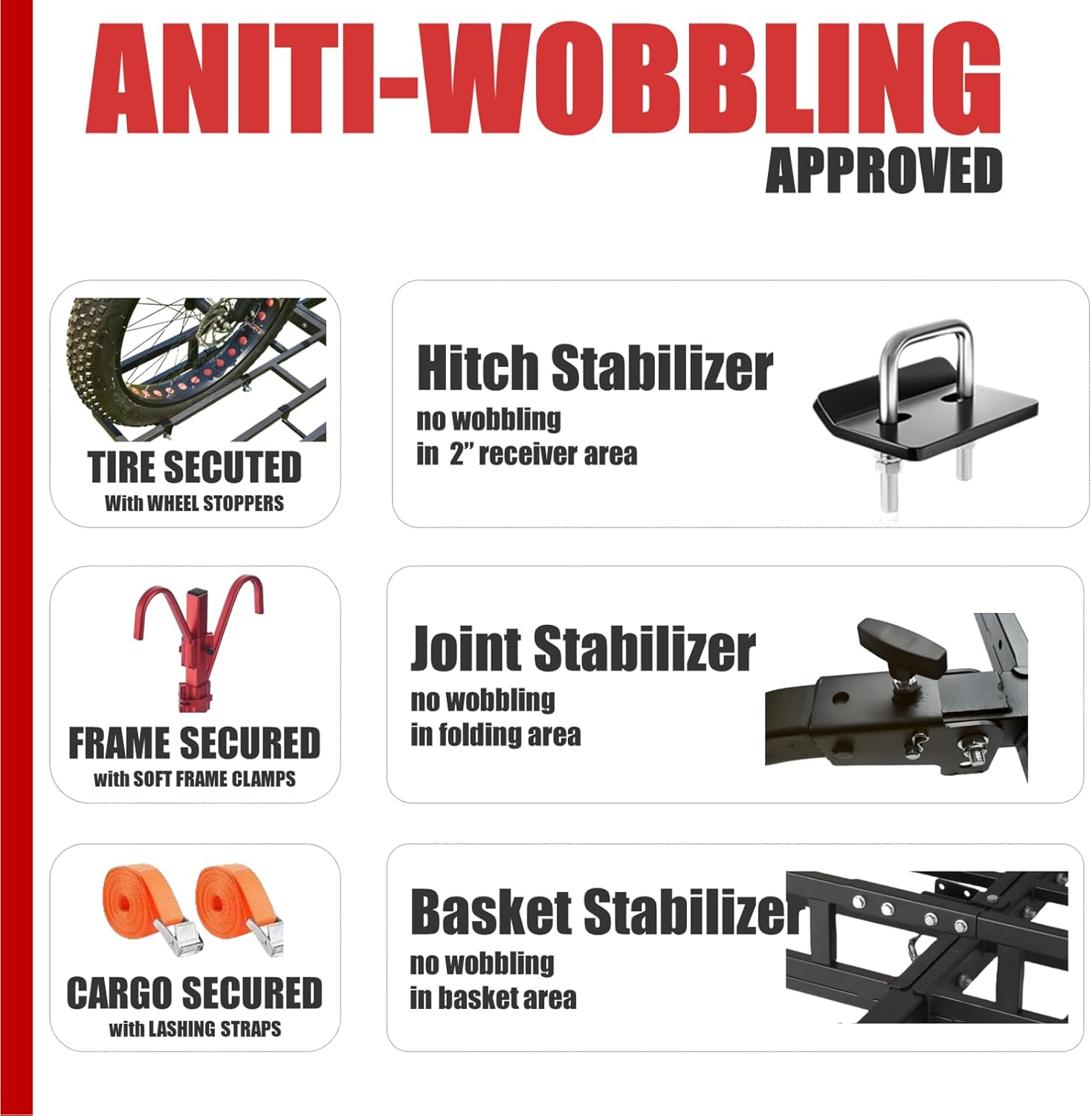 - SAFE & STABLE: Soft frame clamps, 2 lashing straps and wheel stoppers keep bikes and cargos safe during transport. Three stabilizers prevent rattling and wobbling on the road