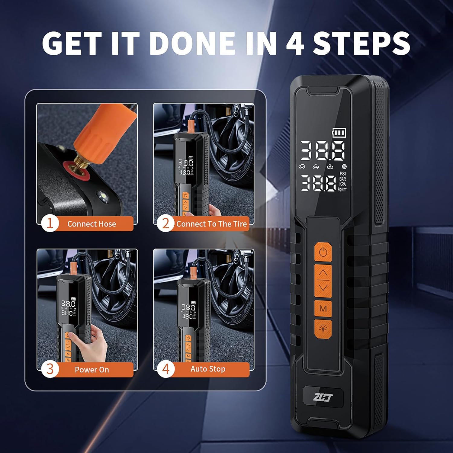- 【Comprehensive Safety Protection & Emergency Lighting】This portable car tire inflator is designed with high/low pressure protection, overcharge protection, over-discharge protection, and short-circuit protection, ensuring safety for both the device and the user. In case of an emergency, the high-brightness light and SOS warning light provide a visible distress signal in dark environments, making this portable tire inflator for car cordless an essential tool for safer and more convenient travel