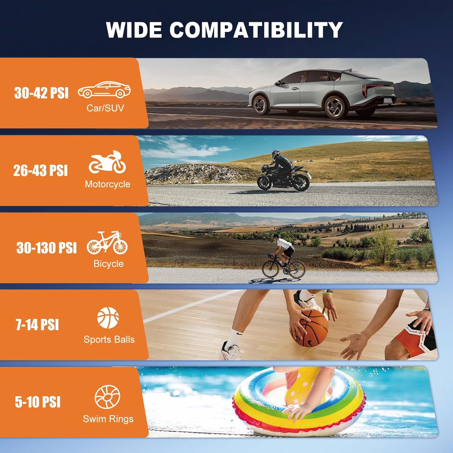 - 【Easy Operation, Automatic Precise Inflation】This cordless air compressor works in just 3 simple steps: connect to the tire → power on → automatic inflation to the preset pressure. The built-in preset modes for Car/SUV (30–42 PSI), Motorcycle (26–43 PSI), Bicycles (30–130 PSI), Ball (7–14 PSI), and Swimming Rings (5–10 PSI) , maximum pressure of 150 PSI. This auto air tire inflator features precise tire pressure measurement and automatically stops once the target pressure is reached