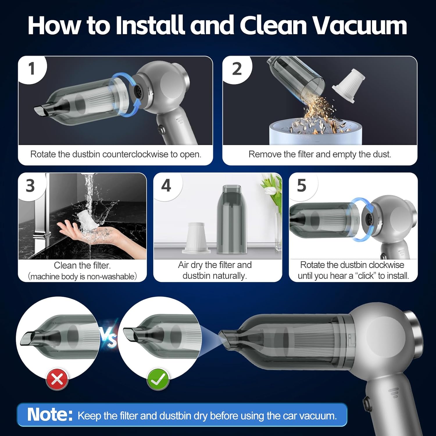- 【Note】 This mini vacuum cleaner cordless has a clogging protection system that detects clogging and automatically shuts down to prevent damage. It is not recommended to overfill the dust cup, otherwise it will affect performance, especially important for a car vacuum cleaner dealing with varied debris.