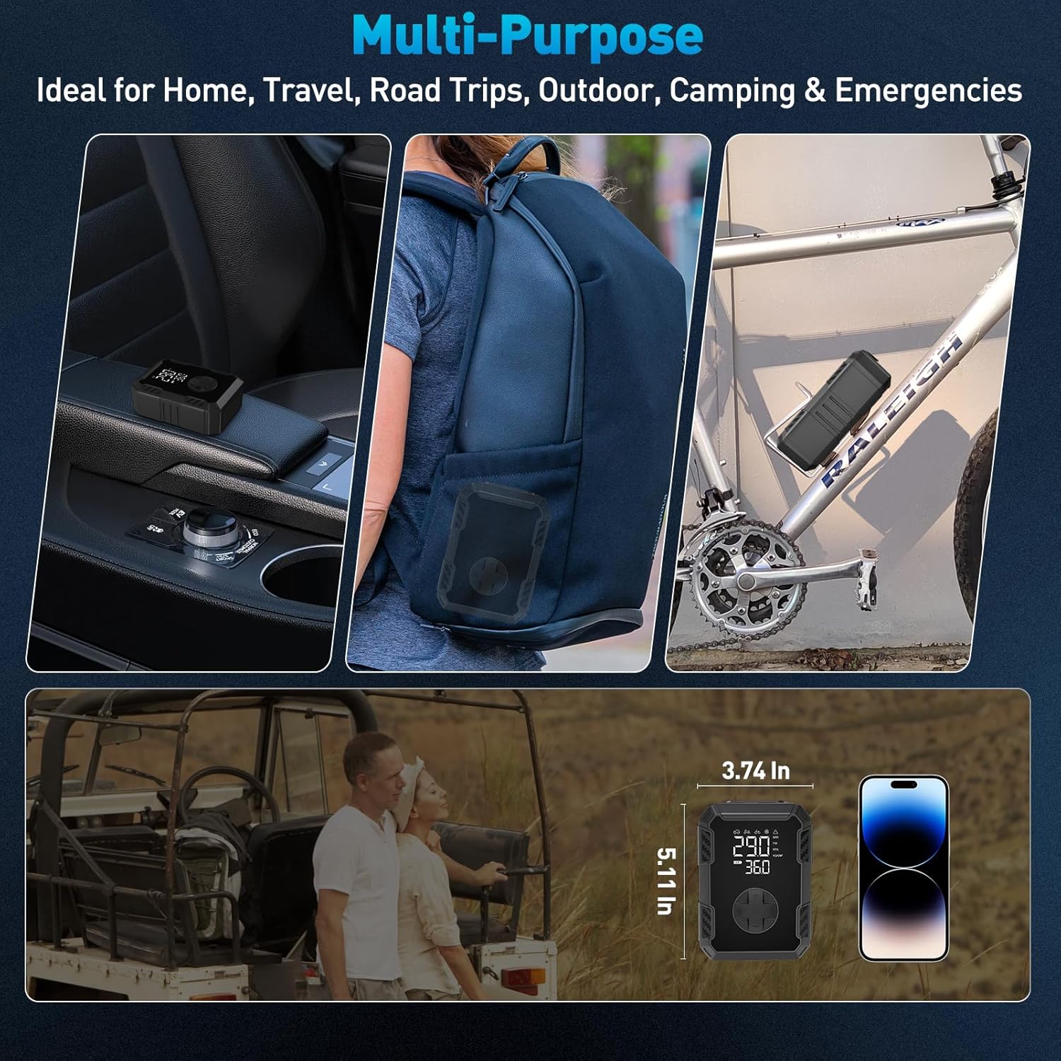 - Compact & Multi-Use Design: Lightweight yet powerful, this air compressor fits in your glove box or trunk. Comes with multiple nozzles for car tires, bike tires, basketballs, pool toys, and more—making it a must-have for outdoor life and daily use.