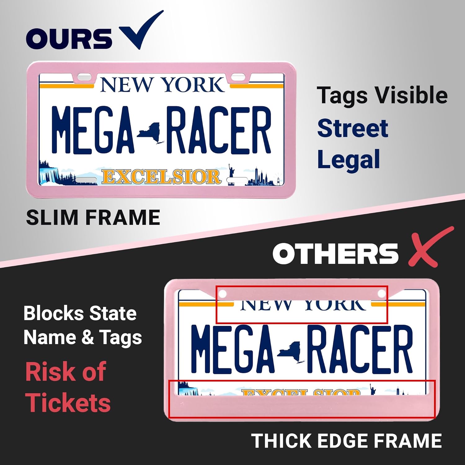 - FEATURES: Mega Racer's Pink License Plate Frame Set contains 1 piece slim license plate frame for women and is mighty strong. This cute sleek style ensures that the state name and registration tag are not blocked.