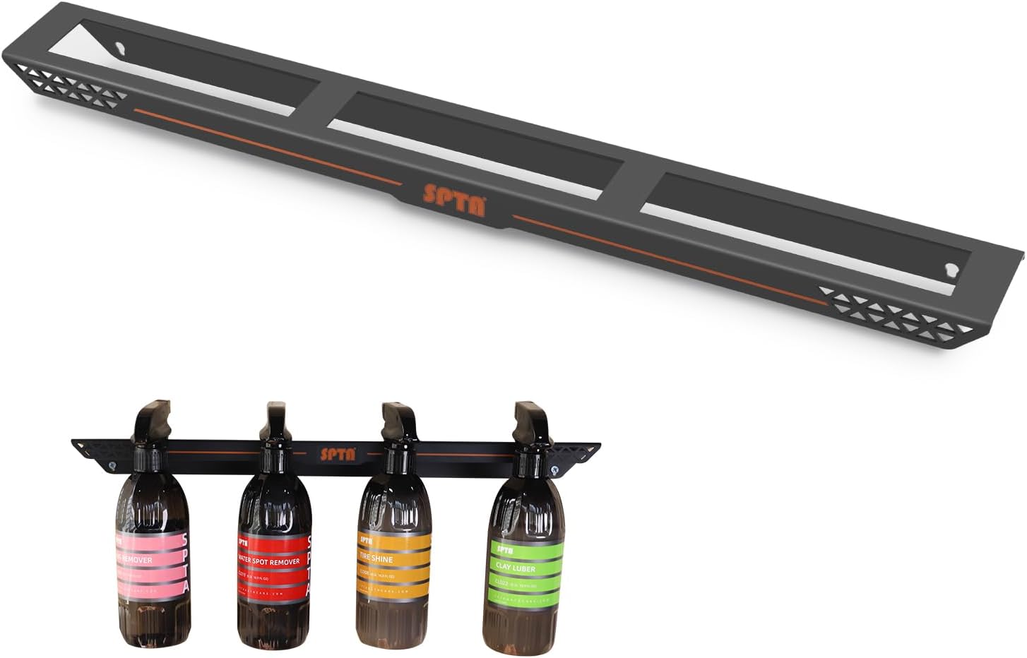 - CAN HOLDS UP TO SIX 16OZ SPRAY BOTTLES: The spray bottle organizer is made of metal, sturdy and durable, suitable for garage or auto detailing store, keep all car care products organized and within reach. This organizer is designed to securely fit up to six 16oz spray bottles, ensuring your most-used detailing products are always within reach.