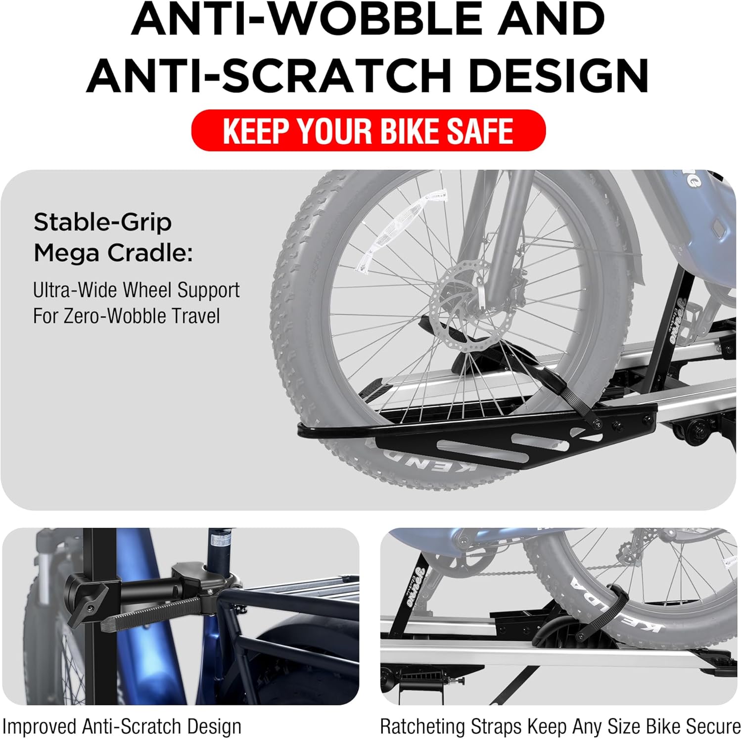 - NO-SCRATCH DESIGN: The rack is elaborately designed to prevent direct contact between the rack's metal surface and your e-bike, avoiding any potential scratch or damage. With ratcheting safety straps, soft padding and rubber covers, your e-bikes will be safely tightened onto the rack, facing the slightest wobbles even on the roughest roads.