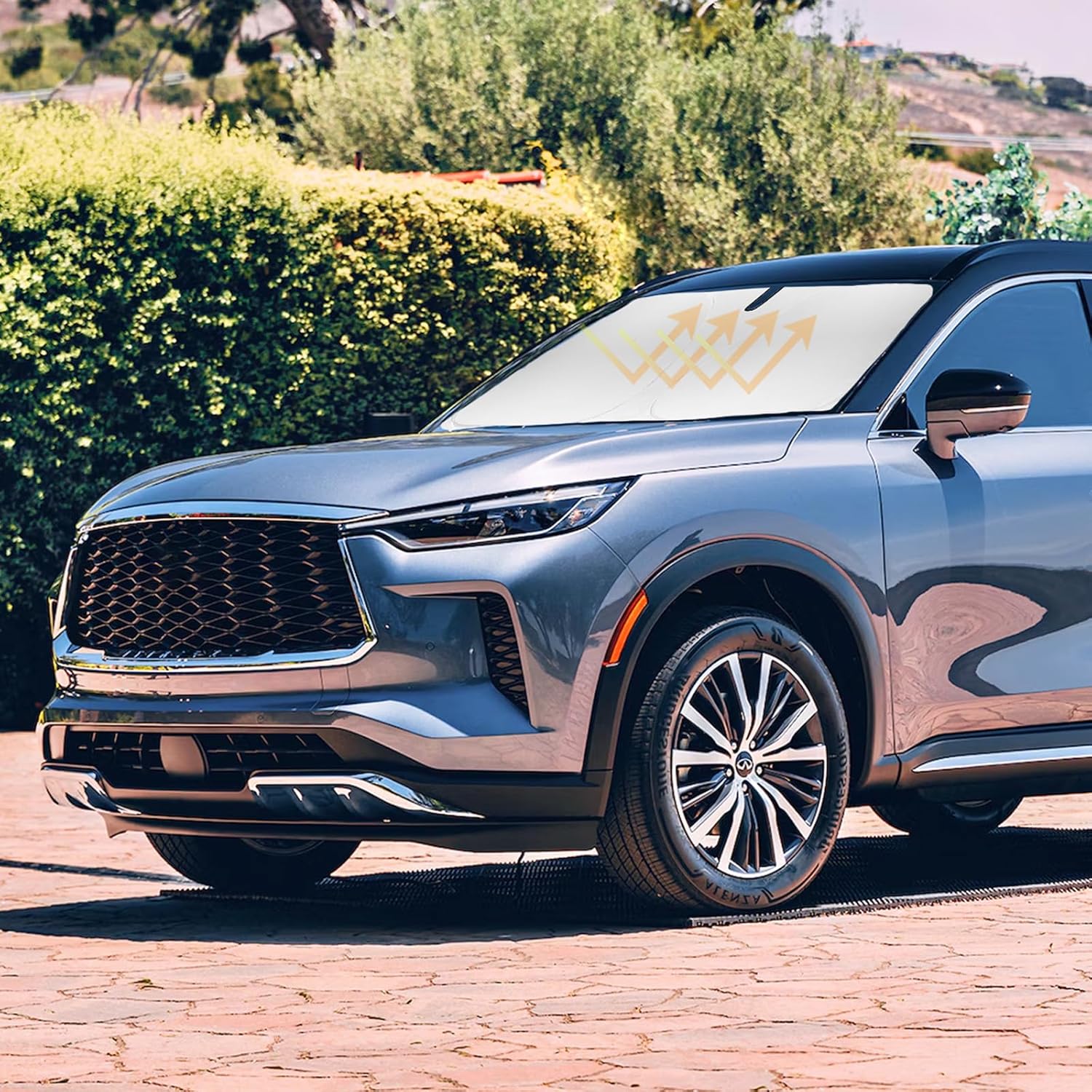 - 【Vehicle Specific】Our Windshield Shade Cover custom fit for 2014-2023 2024 2025 Infiniti QX60, Base, Sport, Hybrid, A-Spec SUV Accessories,Full covered your windshield,No Gap,100% Perfect fit. The precise fit design and reinforced steel ring are sufficient to allow the sun shade to precisely fit the front window without the need for suction cups to hold it in place, effectively protecting your car from the sun's rays.