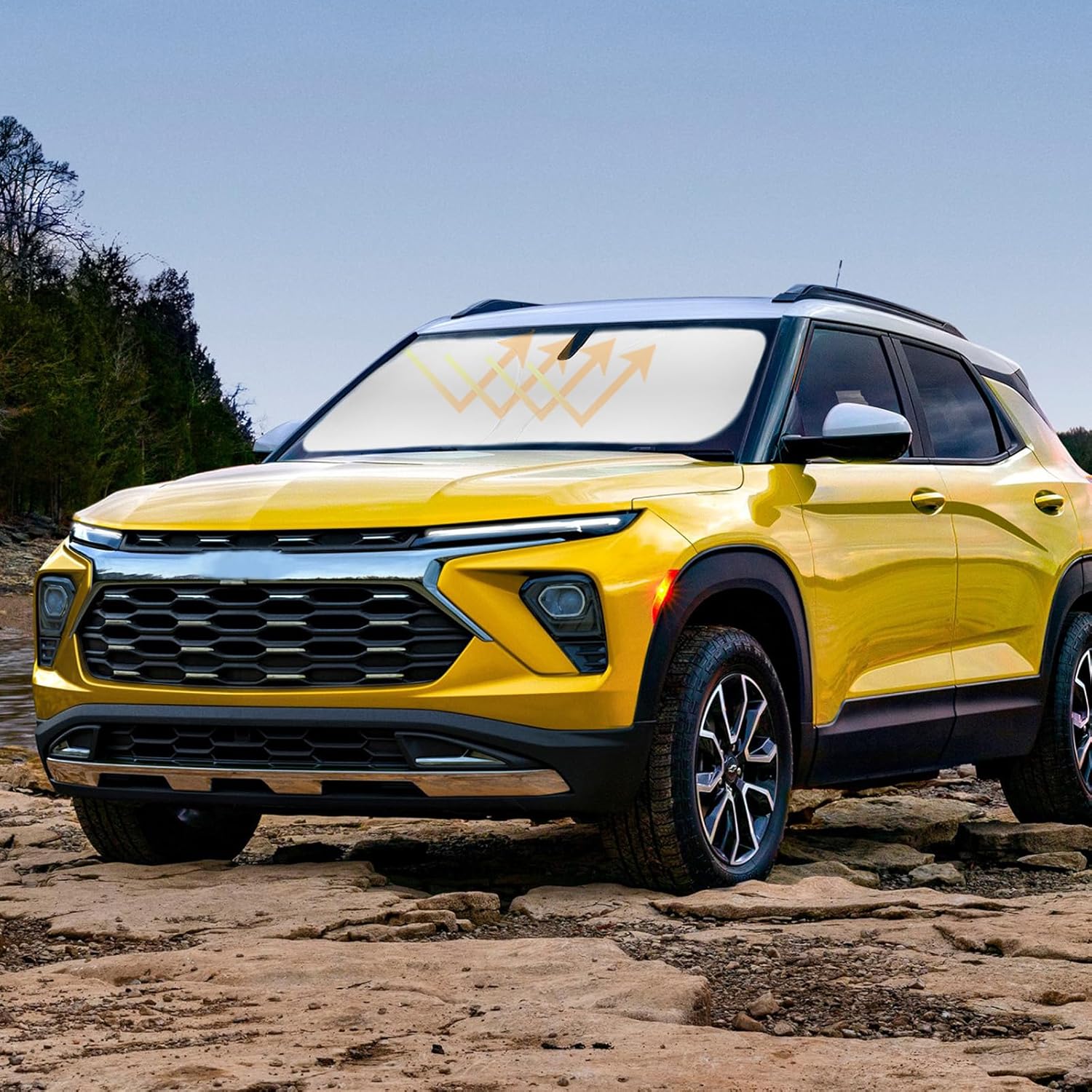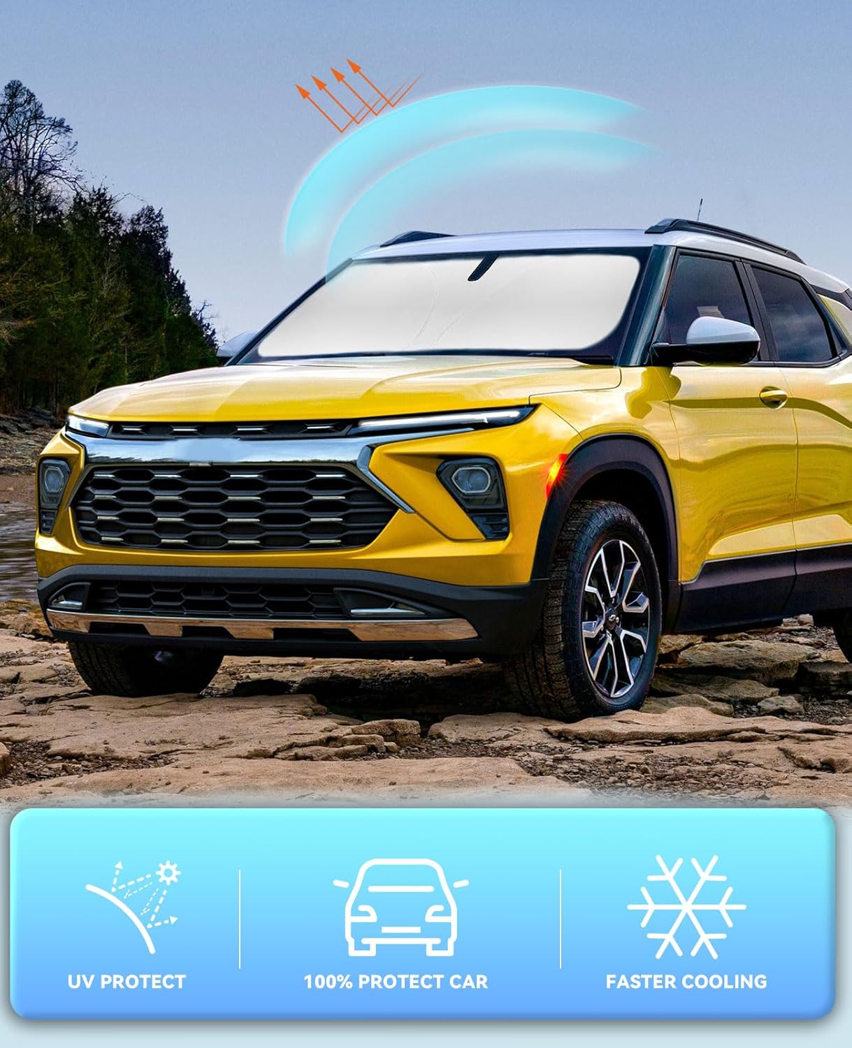 - 【Vehicle Specific】Our Windshield Shade Cover custom fit for Chevrolet Chevy Trailblazer 2021-2024 2025 2026, Base, Sport, Hybrid, A-Spec SUV Accessories,Full covered your windshield,No Gap,100% Perfect fit. The precise fit design and reinforced steel ring are sufficient to allow the sun shade to precisely fit the front window without the need for suction cups to hold it in place, effectively protecting your car from the sun's rays.