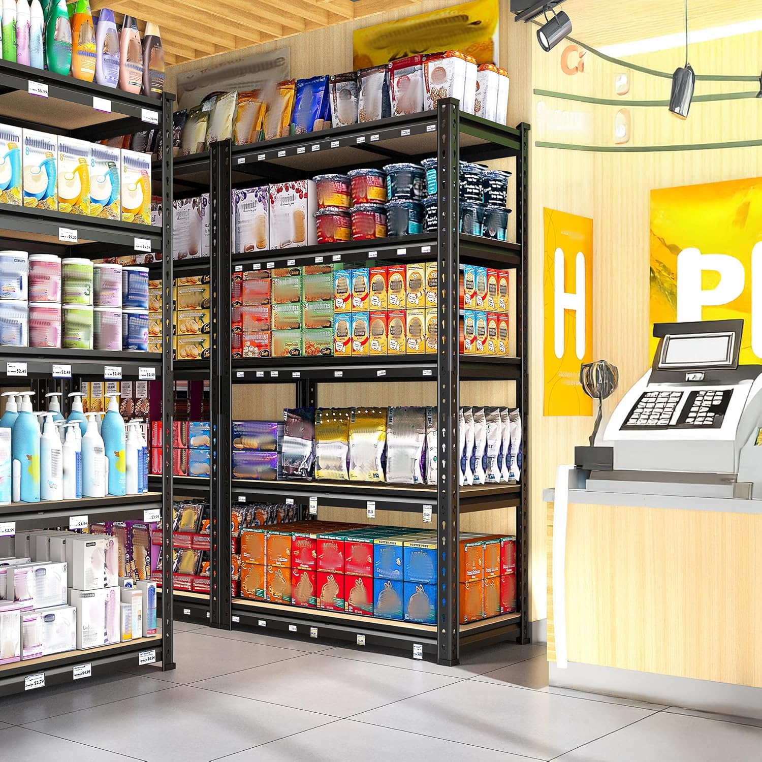 - 【11.8"D x 27.6"W x 60"H Multifunctional Heavy Duty Shelving】The perfect size metal shelf is suitable for garage, pantry, closet, kitchen, warehouse, basement, living room, office, study, and other different spaces. The shelves not only expand your storage space and make your home more clean, but the open space allows you to find items at a glance