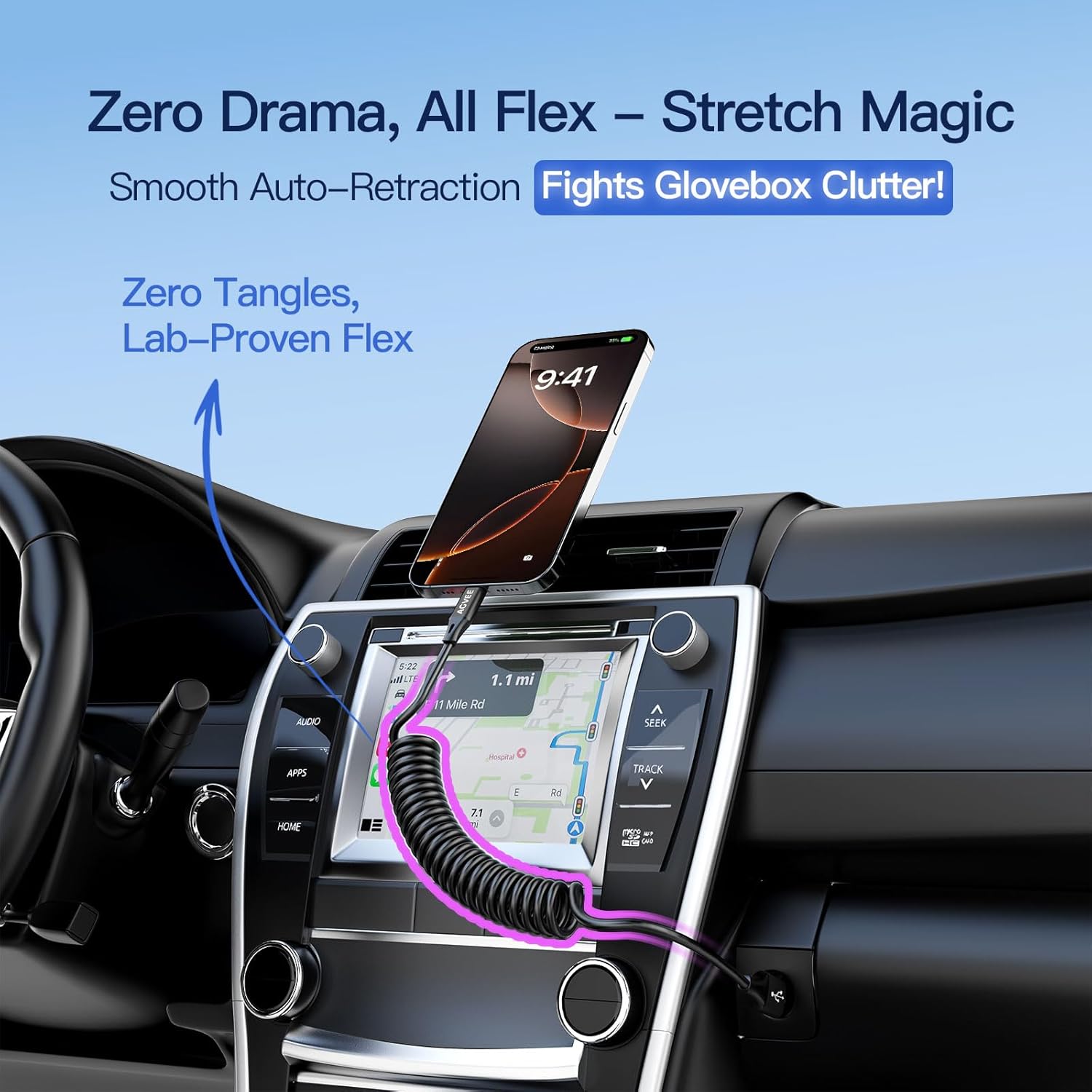 - π[Tame Your Car's Cable Jungle] No more wrestling with spaghetti cords! Our coiled design stretches from short to long, perfect for tight car spaces, then snaps back neatly like a slinky. Keep your cup holders free for coffee, not tangled chaos! Soft and elastic: No more wrestling with stiff, frozen-spaghetti-like cables in winter; Squishy as a pacifier, coils like a zen master.