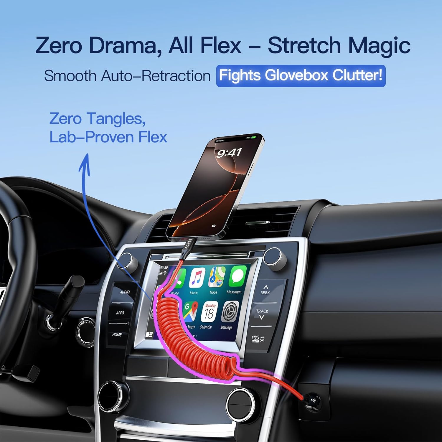 - π[Tame Your Car's Cable Jungle] No more wrestling with spaghetti cords! Our coiled design stretches from short to long, perfect for tight car spaces, then snaps back neatly like a slinky. Keep your cup holders free for coffee, not tangled chaos! Soft and elastic: No more wrestling with stiff, frozen-spaghetti-like cables in winter; Squishy as a pacifier, coils like a zen master.