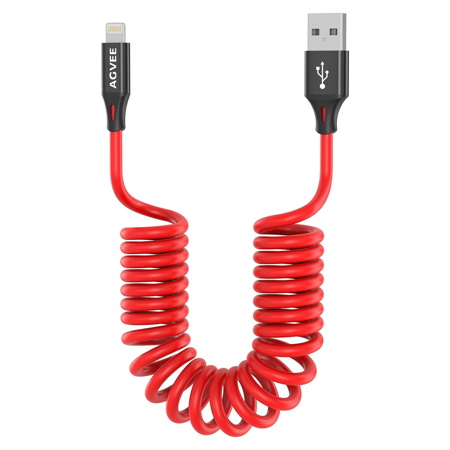 AGVEE 2 Pack 3ft Coiled Short USB to Lightning Charging Cable [MFI Certified] 3A Fast Charger Cord in Car for iPhone 14/13/12/11/XS/8/7/6/5 CarPlay, iPad, iPod, Red