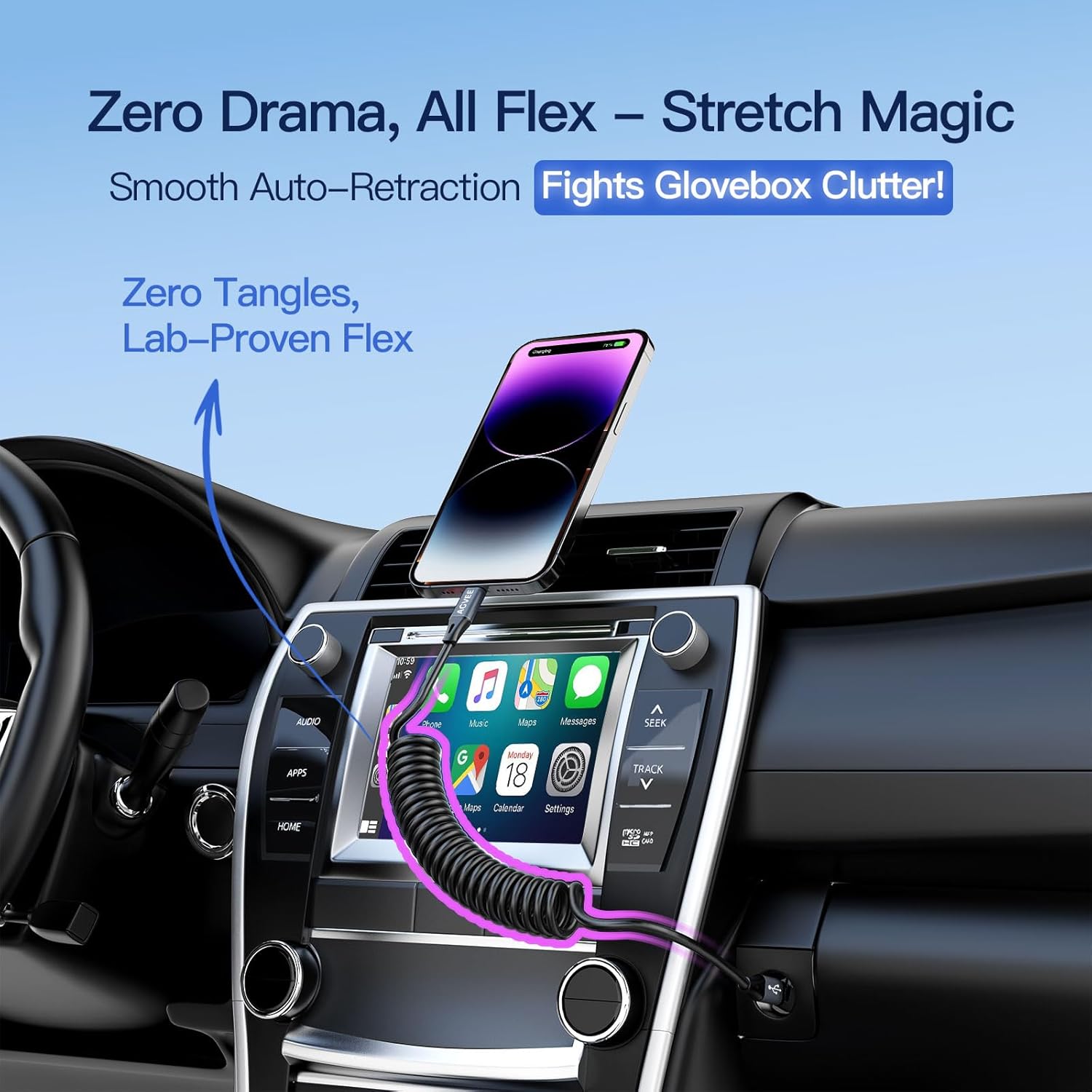 - 🚗[Tame Your Car's Cable Jungle] No more wrestling with spaghetti cords! Our coiled design stretches from short to long, perfect for tight car spaces, then snaps back neatly like a slinky. Keep your cup holders free for coffee, not tangled chaos! Soft and elastic: No more wrestling with stiff, frozen-spaghetti-like cables in winter; Squishy as a pacifier, coils like a zen master.