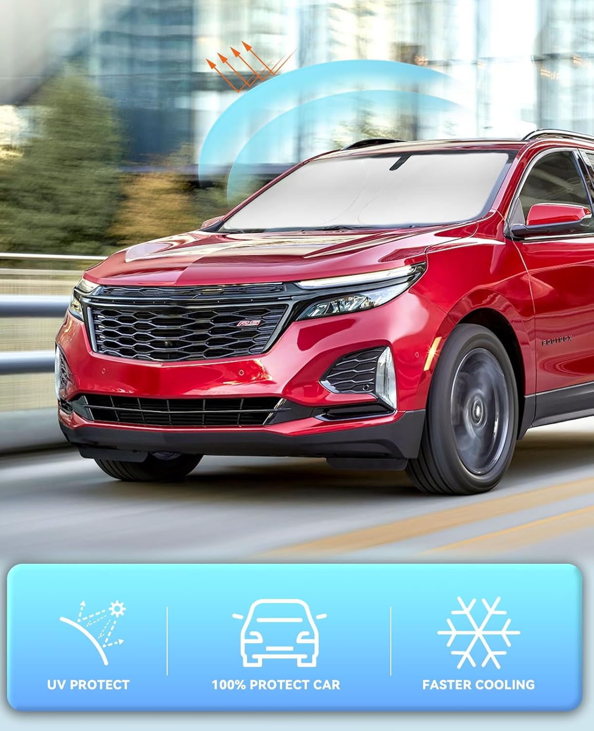 - 【Vehicle Specific】Our Windshield Shade Cover custom fit for 2010 2018-2024 2025 Chevy Chevrolet Equinox Accessories ,Full covered your windshield,No Gap,100% Perfect fit. The precise fit design and reinforced steel ring are sufficient to allow the sun shade to precisely fit the front window without the need for suction cups to hold it in place, effectively protecting your car from the sun's rays.