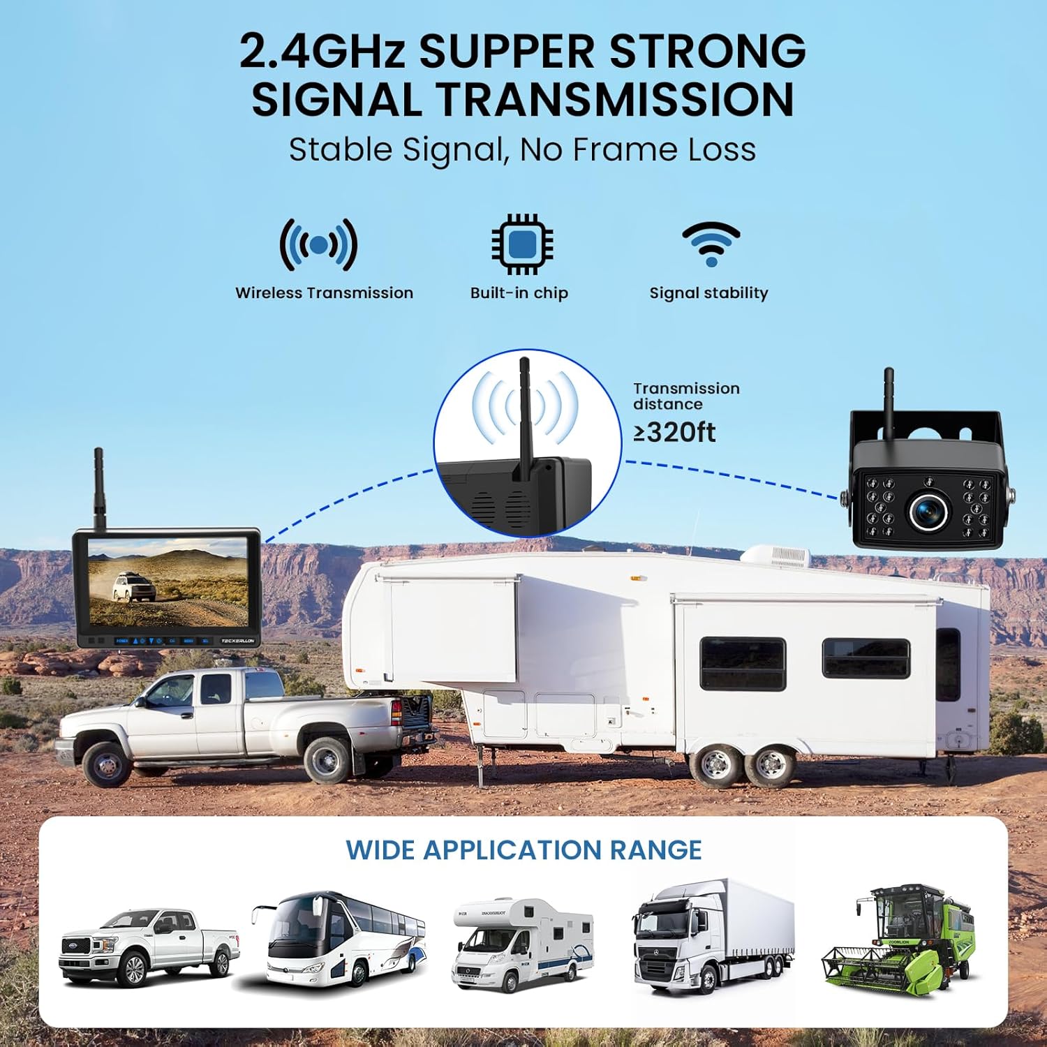 - 2.4GHZ ULTRA-STRONG WIRELESS TRANSMISSION: Equipped with 2.4GHz technology and a high-performance chip, this backup camera delivers a stable, crystal-clear signal up to 320 feet (97.5 meters) with zero frame loss. Enjoy seamless video streaming and a sharp, reliable view of your surroundings wherever you go.