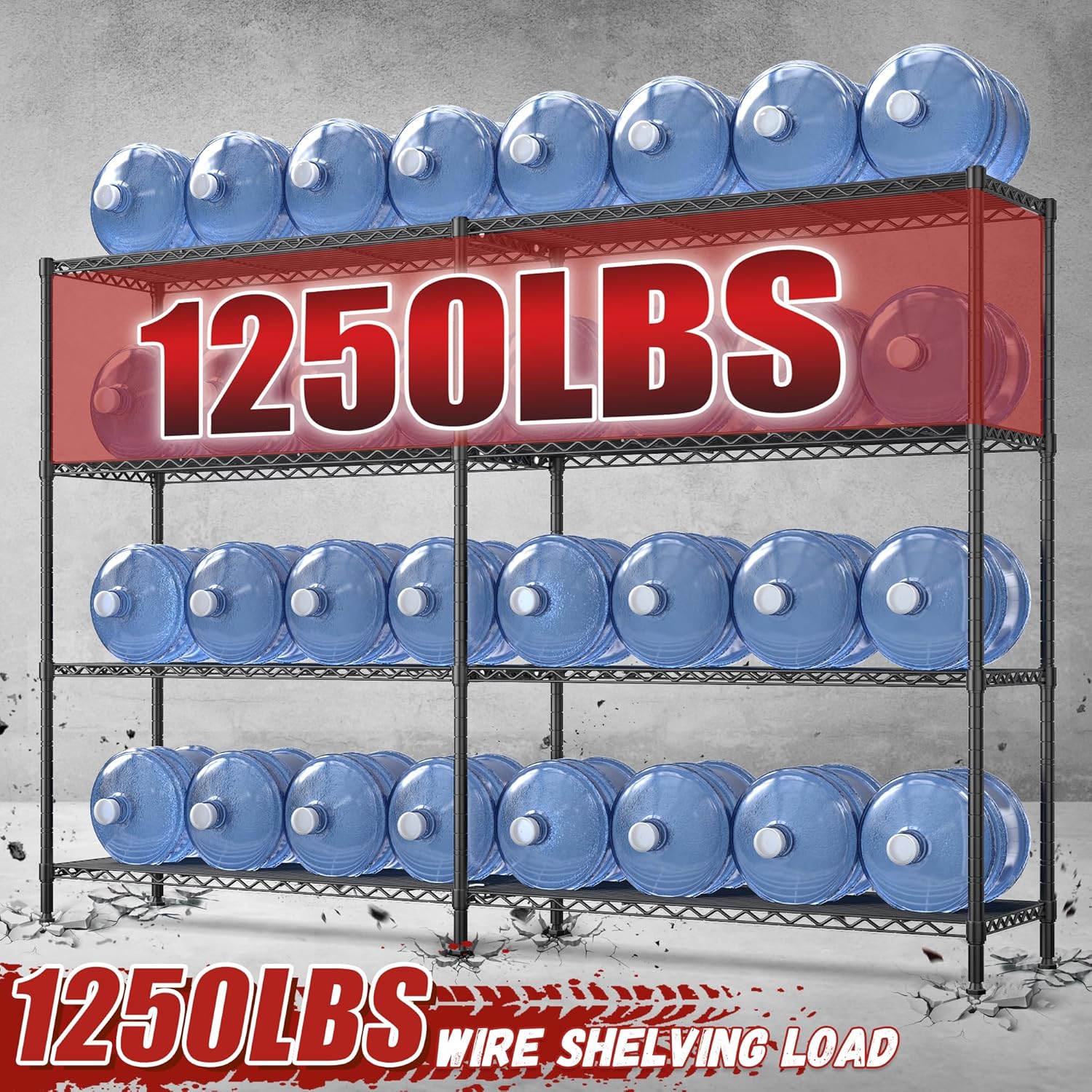 - 【1250 LBS Capacity Super Sturdy Storage Shelving Storage Rack】This Metal shelves for storage made of heavy duty steel wire,and has undergone special coating treatment.Every solid thickened shelving with extra stiffener,can easily bear 250LBS a total of 1250 lbs bearing capacity .which means this metal shelving unit will always be your reliable partner.