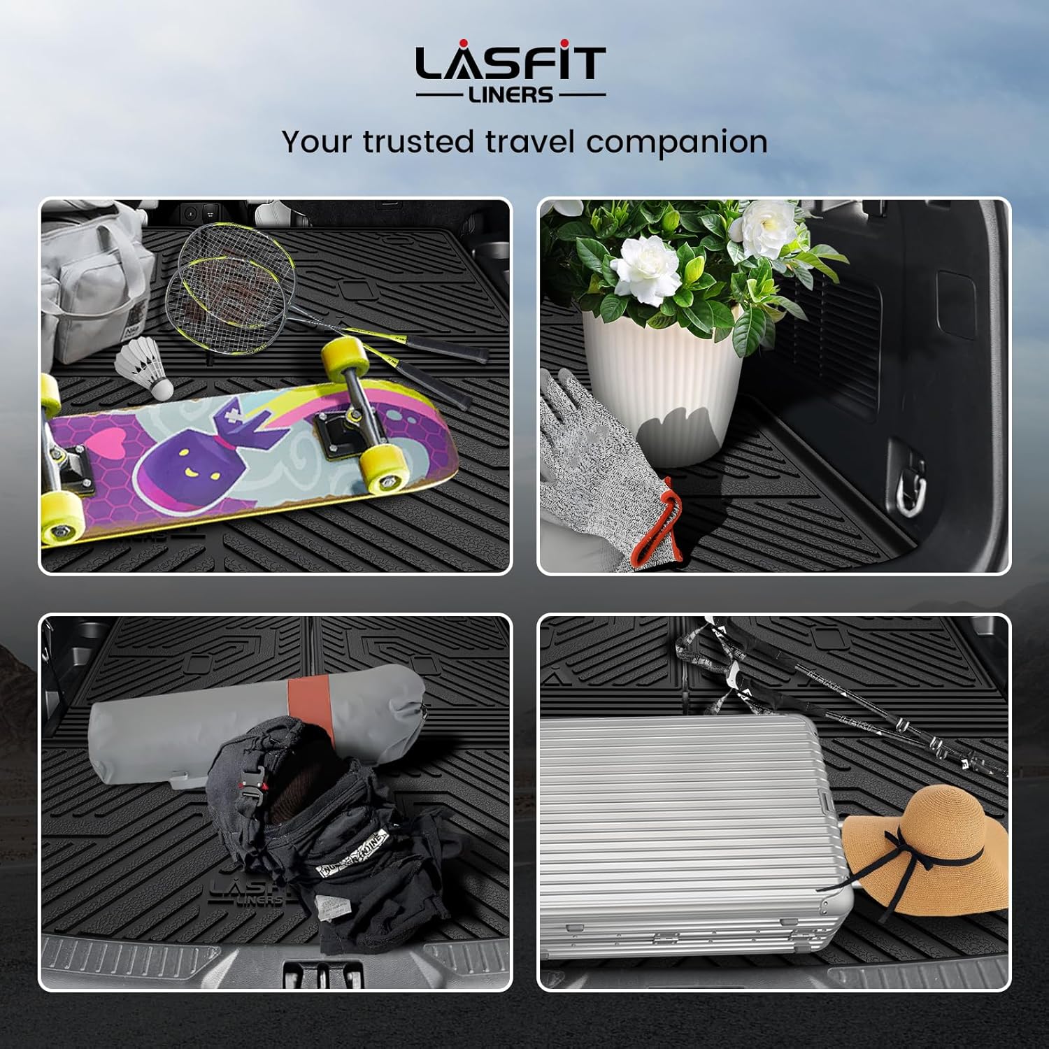 - 【Full-Coverage Protection】LASFIT floor mats carefully consider coverage during the real car data scanning process to ensure all-around protection for your vehicle. Whether your third-row seats are folded or upright, the mats precisely cover every corner of the trunk and seatback , including contours, seatback areas, and seams