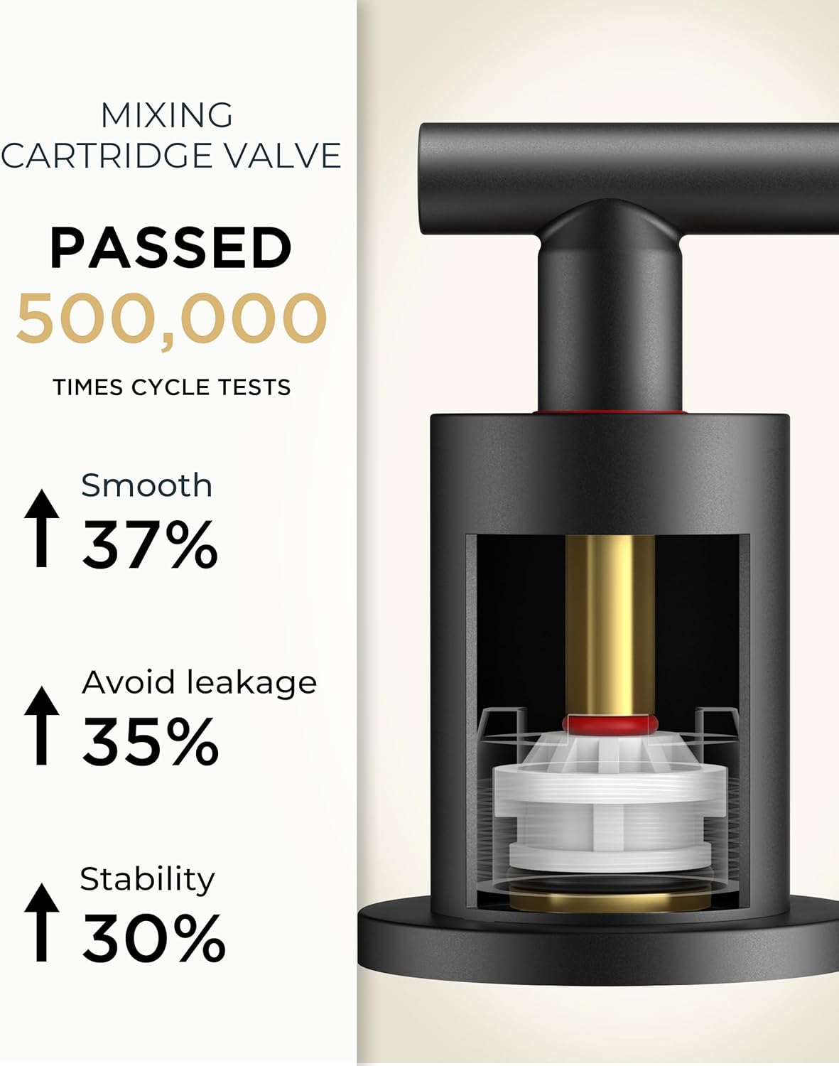 - RELIABLE PERFORMANCE: Upgraded mixing cartridge withstands 500K+ cycle testing (3x traditional models). Full cUPC+NSF+ANSI61+WaterSense+DOE+CPF-certified 316 stainless steel matte black faucet for bathroom sink ensures safe, healthy water delivery