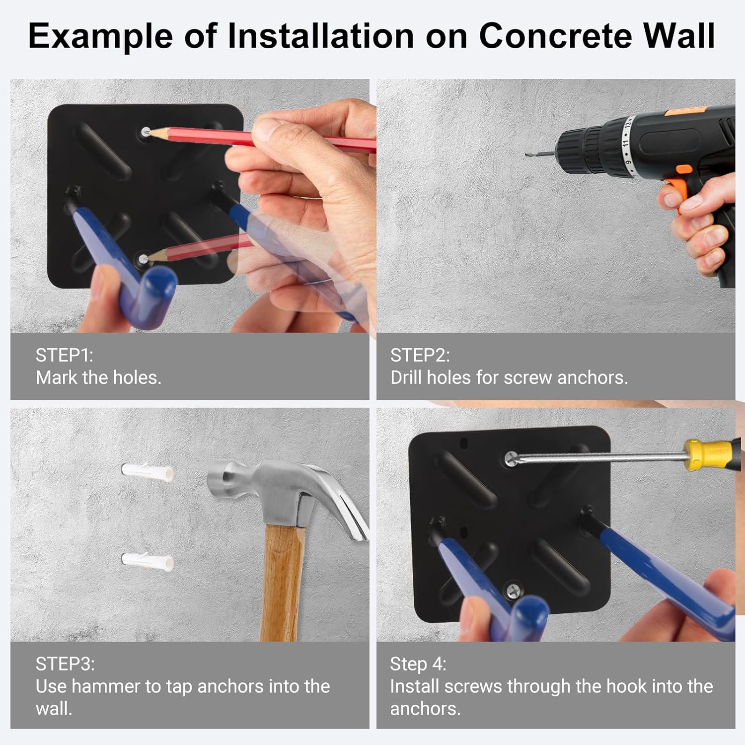 - Wall Mounting Accessory Included: 8pcs steel extended screws and 8pcs white wall anchors provided for you to install utility hooks quickly with a driller. Collecting your clutter tools now in a tidy status!