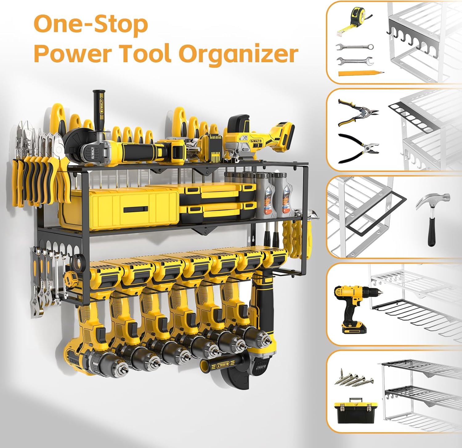 Power Tool Organizer Wall Mount Cordless,15 Min Fast Install Metal Garage Tool Storage Organizer Heavy Duty 3 Layers 7 Drill Power Tool Holder Storage Rack Tool Shelf Wall Mount for Shop Organization