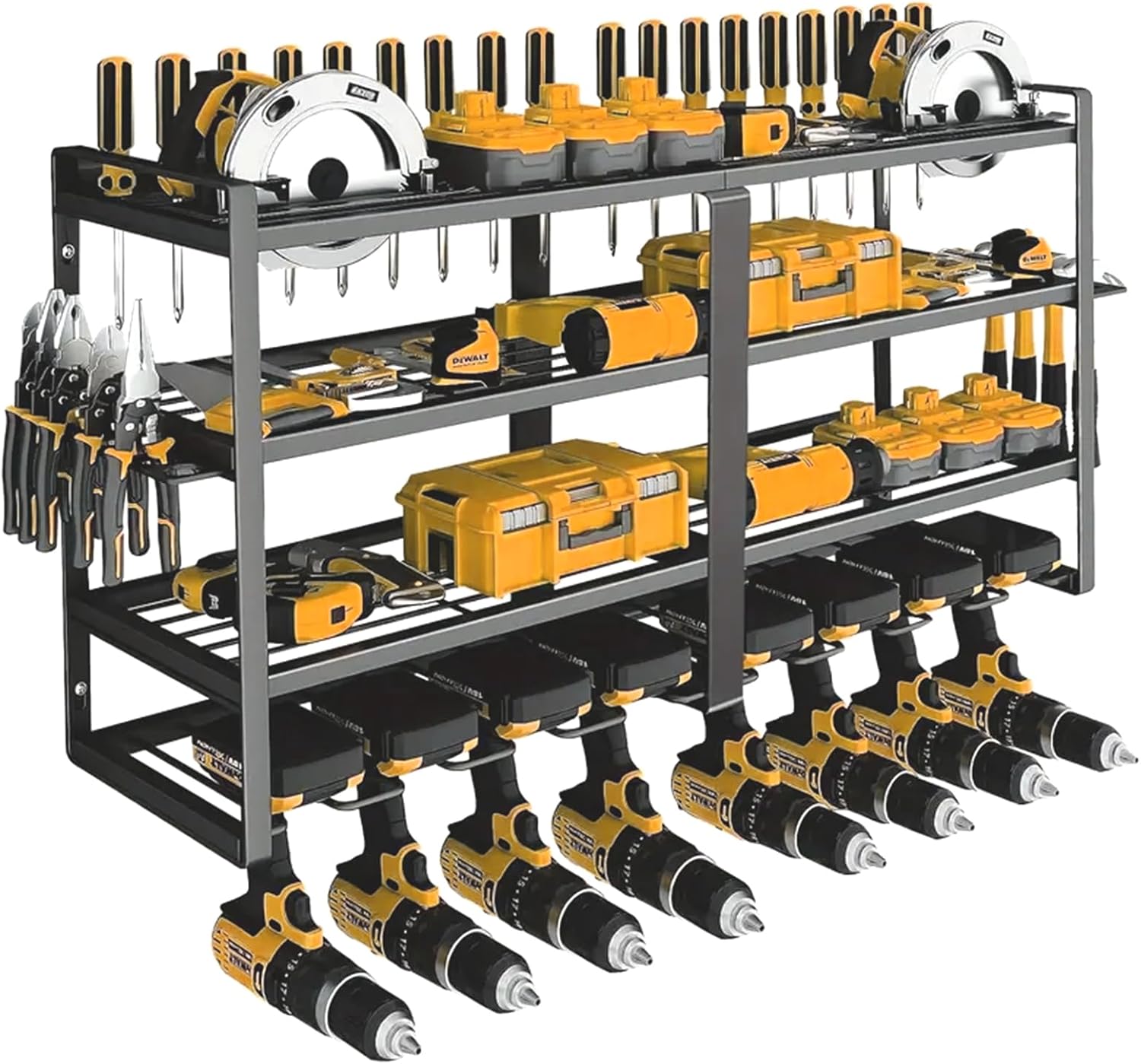 - LARGE CAPACITY DESIGN: Power tool storage rack with 4 layers and 8 drill holders. This wall mount power tool organizer features a 4-tier design with ample space. It holds up to 8 cordless drills in the bottom tier, the height of the middle shelf is 5.1'', which is enough to accommodate heavy-duty or small-sized tools. And a hammer holder, pliers holder and screwdriver holder are added to the side.