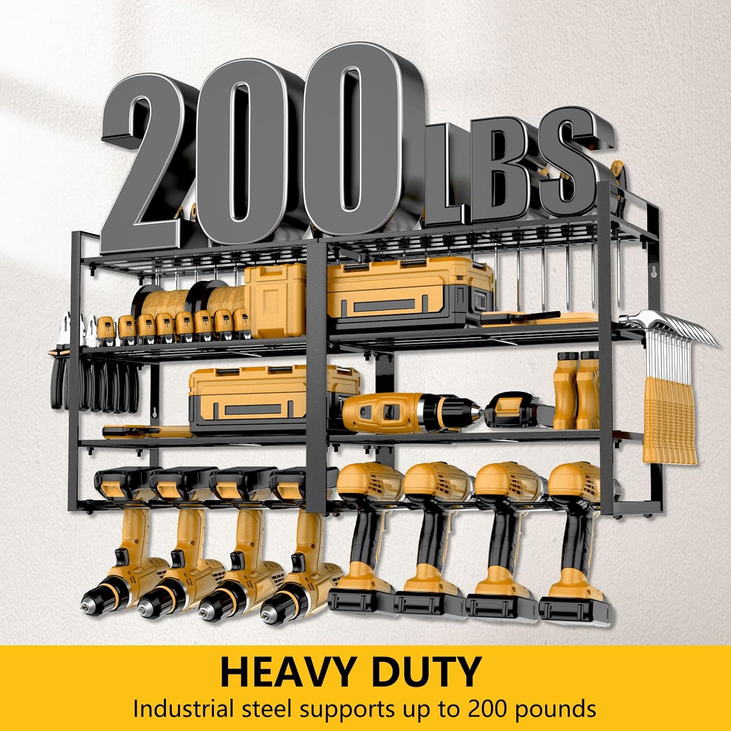 - 200 LBS LOAD-BEARING CAPACITY: The cordless drill organizer is made of thickened large-diameter steel with integrated drilling groove hooks for greater load-bearing capacity and durability, while equipped with ribbed plastic wall anchors, Each layer of tool slots can hold a maximum weight of 40lbs, you never have to worry about the drill rack breaking or tools falling off