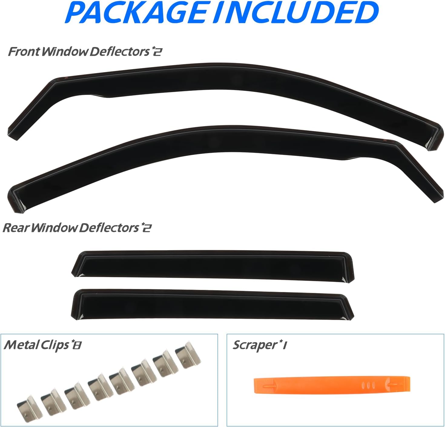 - 【In Channel Design】 CHYKORLA Window vent visors install in the window channel, provides perfect fit and sleek look for your car. Come with 4 pcs side window deflectors, 8 pcs clips, 1 pcs plastic Crowbar for a durable and secure installation. No complicated instructions are needed. Attention: Please apply the clip to fix the rain guards
