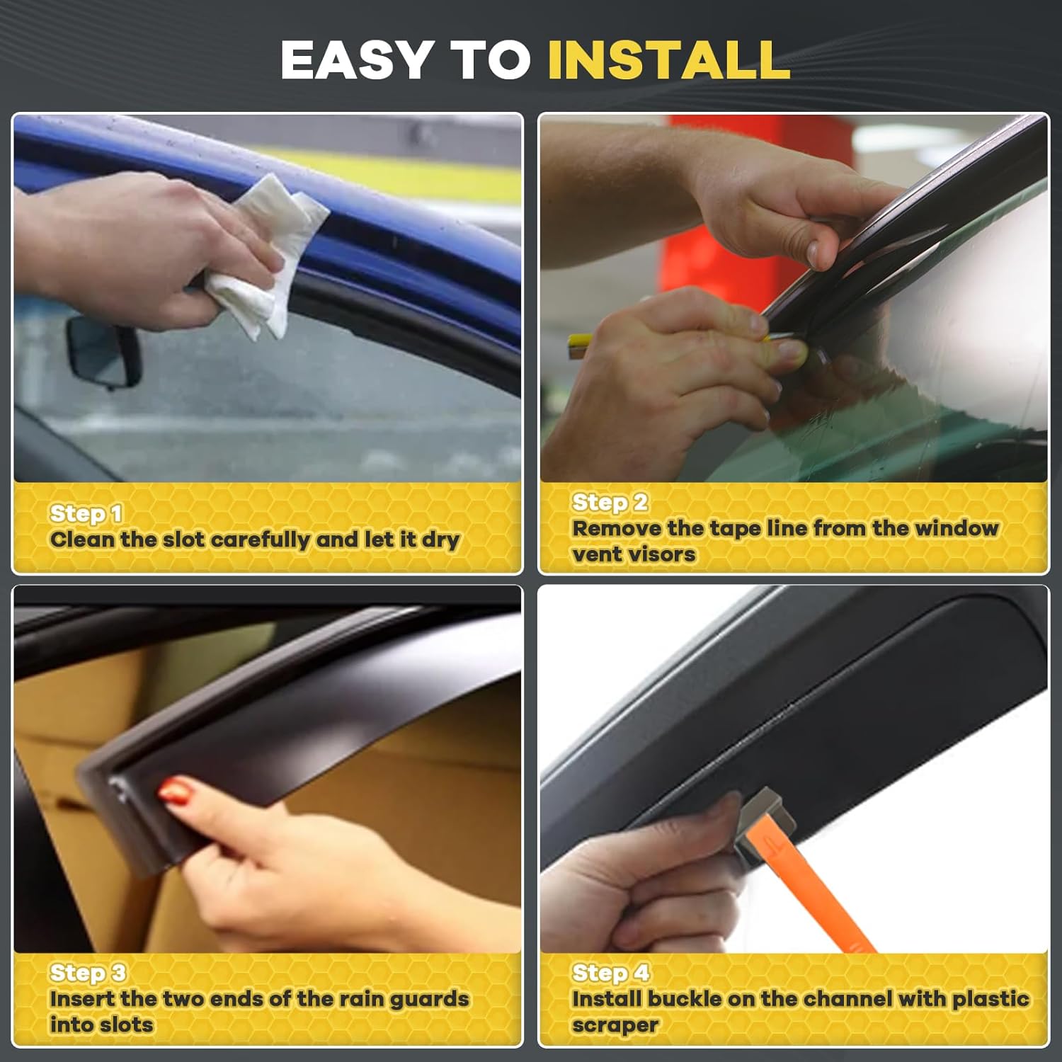 - 【Note】 Please watch the install video carefully before installing the window deflectors. Please avoid washing your car within 48 hours after installation. If there is any question about the vent shades, please feel free to contact us. We will reply to you in 24hrs