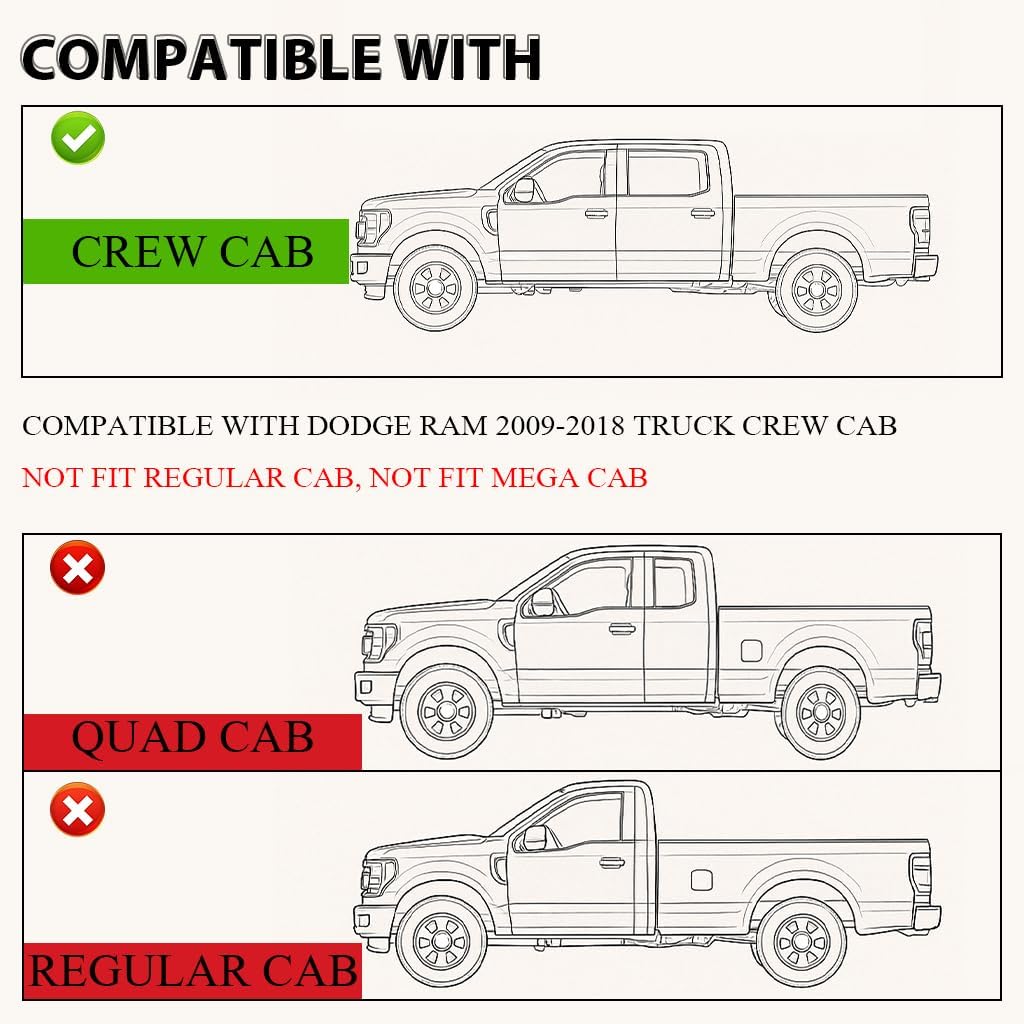- COMPATIBILITY: Compatible with Dodge Ram 2009-2018 Truck Crew Cab/Not Fit Quad Cab