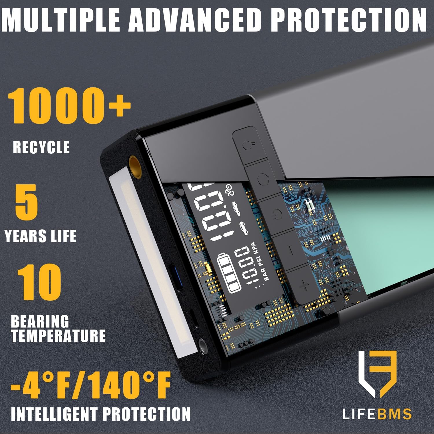 - What You Gat - The package includes 1 jump starter with air compressor, 1 smart jumper cable, 1 USB-A to USB-C cable, 1 USB-C to USB-C cable, 1 carrying bag, 1 pump tube, 5 air nozzles, 1 user manual, backed by 18-month warranty and lifetime tech support. For any after-sales inquiries, please don't hesitate to contact us.