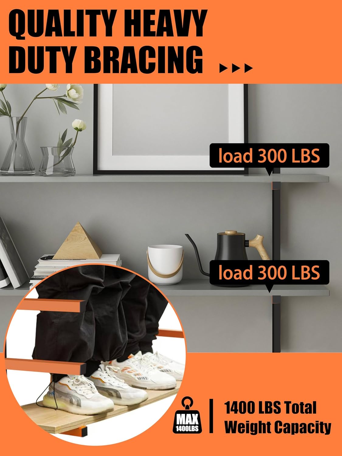 - Heavy Duty Wall Shelf, Holds Up to 1400 lbs: This garage wall shelving is designed to support heavy loads up to 1400 lbs. Good for wood storage, tools, and other garage essentials securely