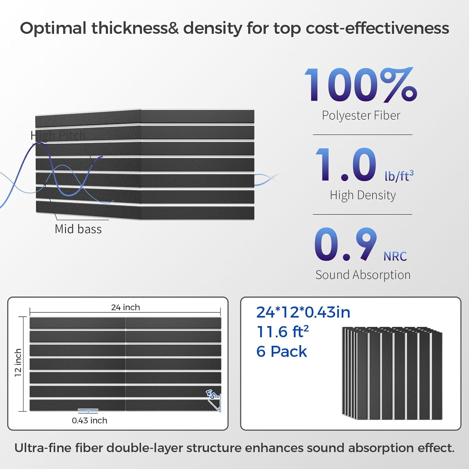 6 Pack 2-Layer Fold Soundproof Wall Panels, 24 x 12 x 0.43 in Large Sound Proof Foam Panels for Walls, 0.9lb/ft³ High Density, 3D Acoustic Panels,Artistic Noise Dampening Panels Black&White