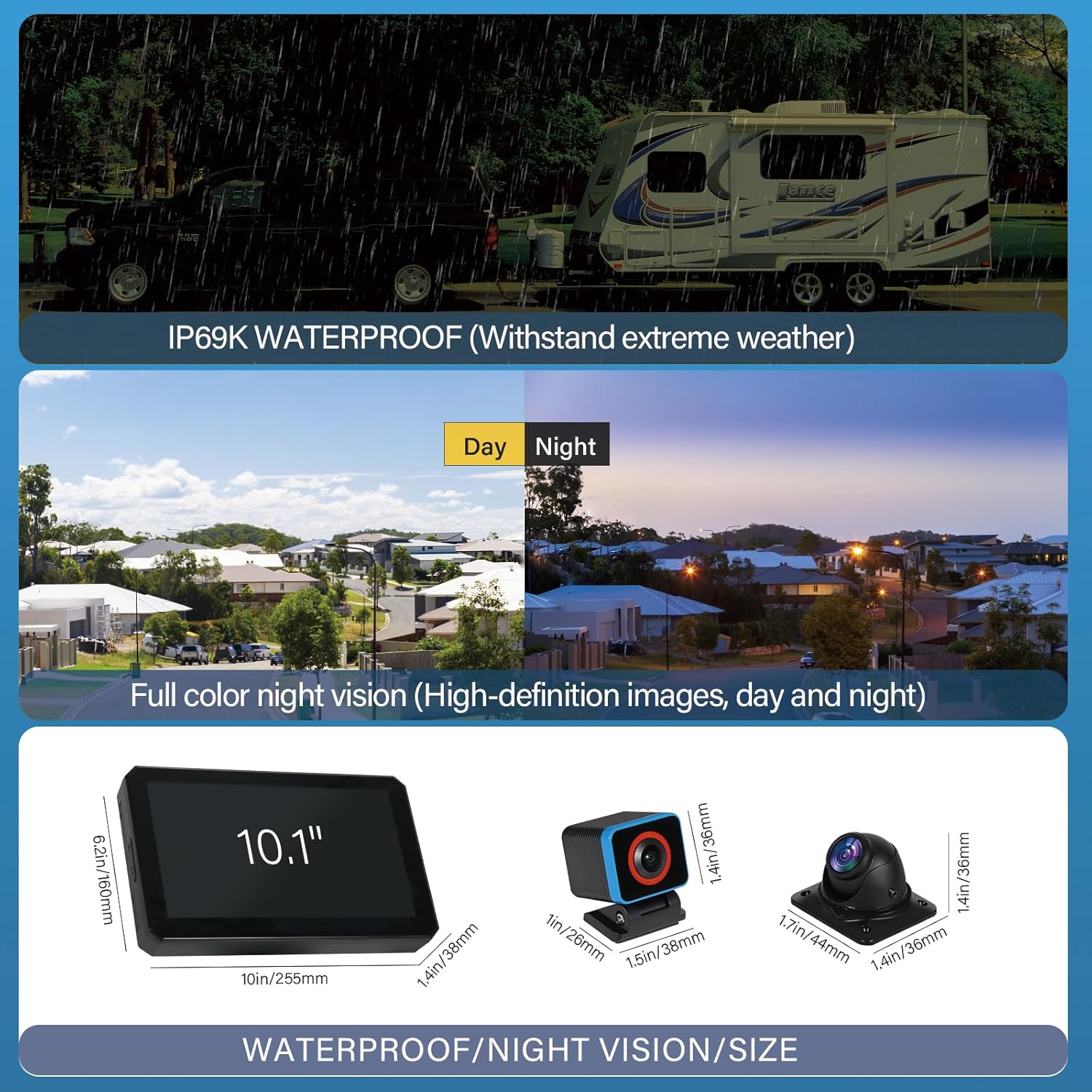 - 【IP69 waterproof and Night Vision】 Using full-glue sealing technology for cameras , the truck system can work normally in various extreme bad weathers. Full color night vision (High-definition images, day and night)
