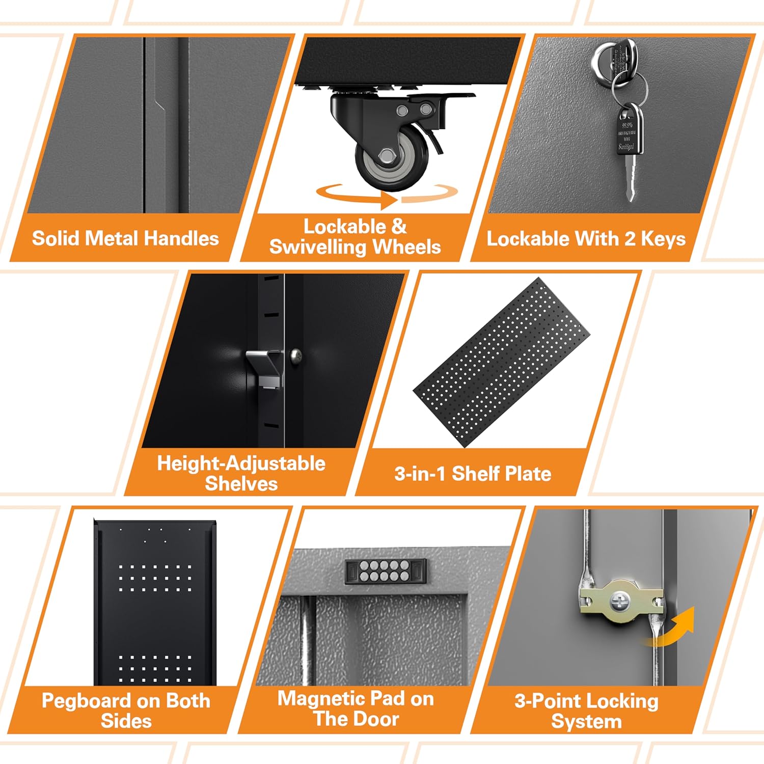 - 🧑🔧【Effortless Mobility and Easy Assembly】With four 360-degree swivel casters that can be locked when not in motion, this garage cabinets with wheels is easy to move around yet stable when needed. The included assembly instructions clearly illustrate each component and step, along with an assembly video for reference, enabling one person to complete the setup in approximately 40 minutes.