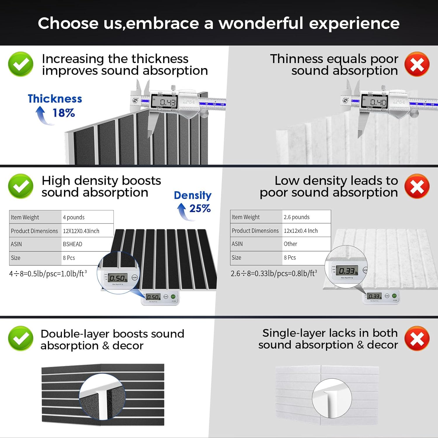 - Widely applicable: Soundproofing panels self-adhesive size: 12" x 12" x 0.43", 8% thicker than traditional thickness, can provide more effective noise blocking, suitable for a variety of high-demand environments. Suitable for home theaters, professional studios, music rooms, can effectively improve the audio effect, enhance the work and entertainment experience in various places such as game rooms, bedrooms, offices, etc. Beautifully packaged, it is also a wonderful gift