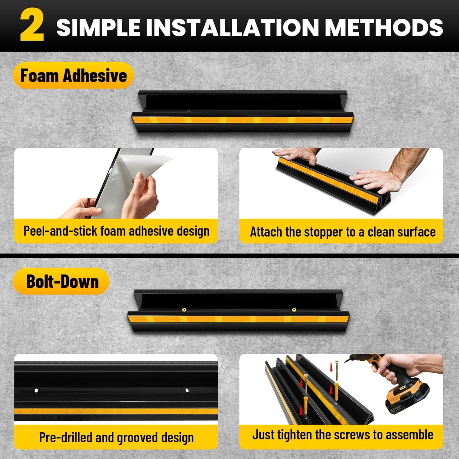 - Easy Installation: The garage car stopper features a peel-and-stick foam adhesive design for quick and effortless installation. The pre-drilled holes allow for the utilization of the included screws to ensure the stopper stays in place when subjected to tire impacts