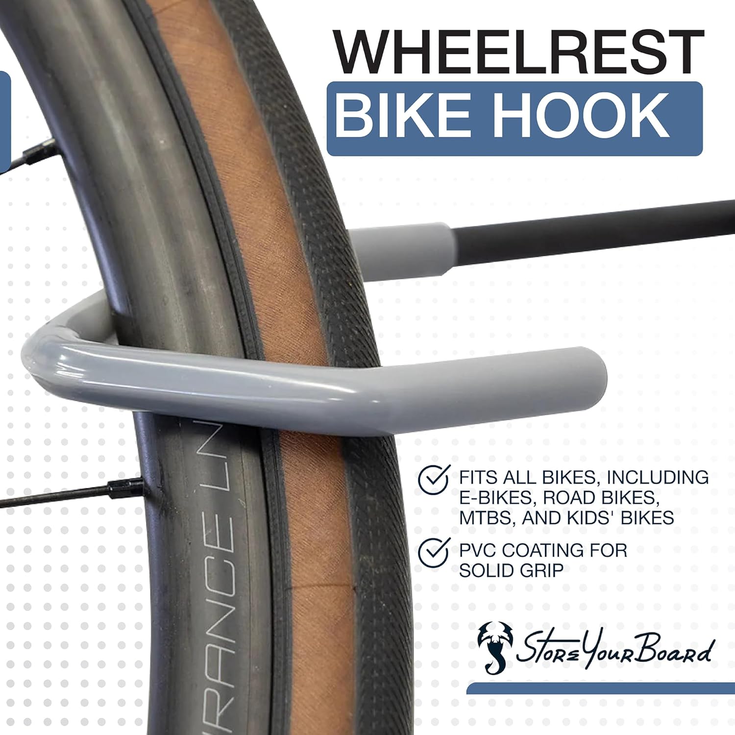 - Wall Mounted Bike Hanger: Hang your bicycle in your garage, home, or apartment with the WheelRest. This vertical bike hook holds all types of bikes with tires up to 3" wide and weighing up to 75 lbs per hook, including road, mountain, kids’, and ebikes.
