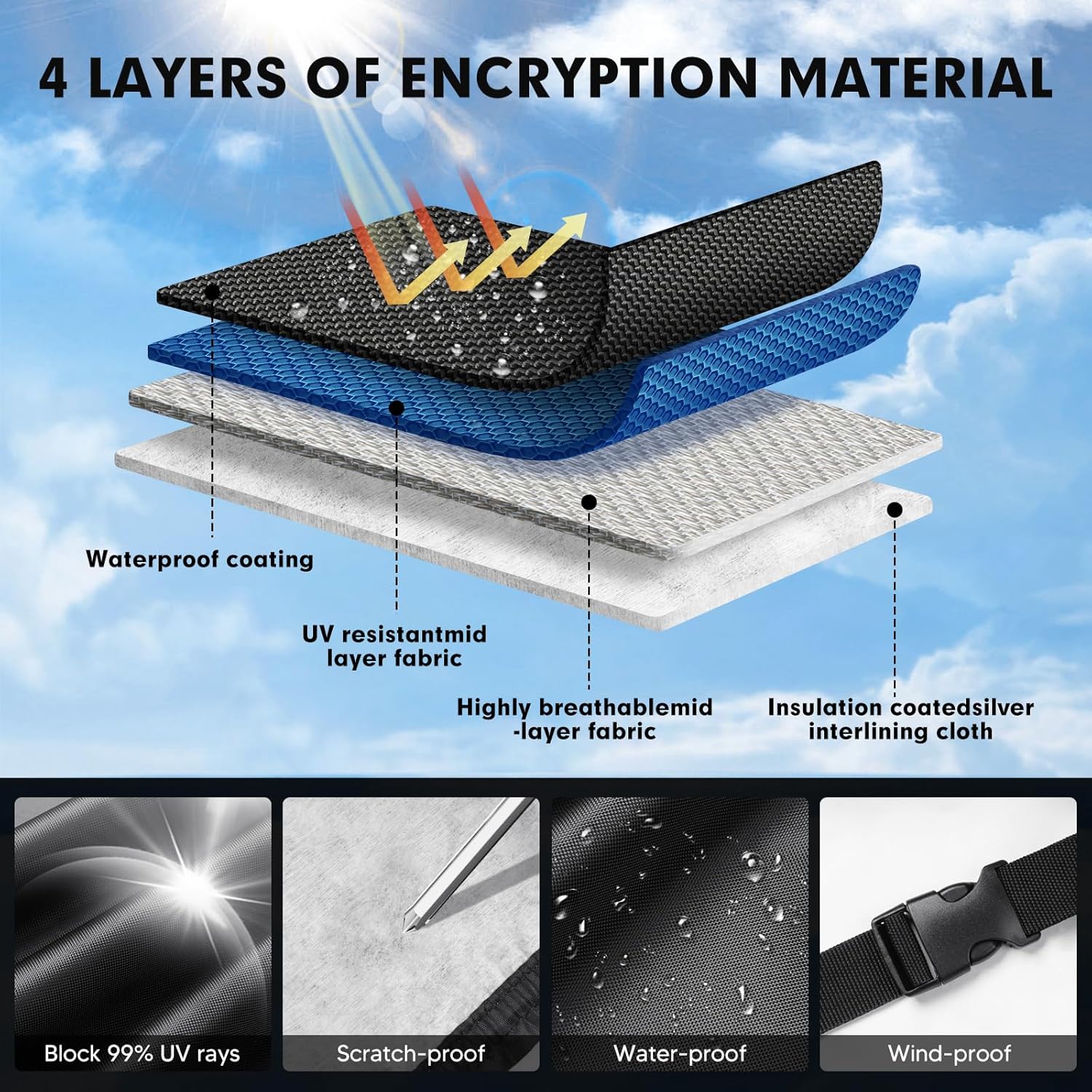 - Wind-Resistant Design:Equipped with a durable wind belt, the adjustable belt is designed to protect the Wrangler cab cover from being blown away in high winds or storms.Driver side door zippers in the car cover for easy and time-saving access to the interior.