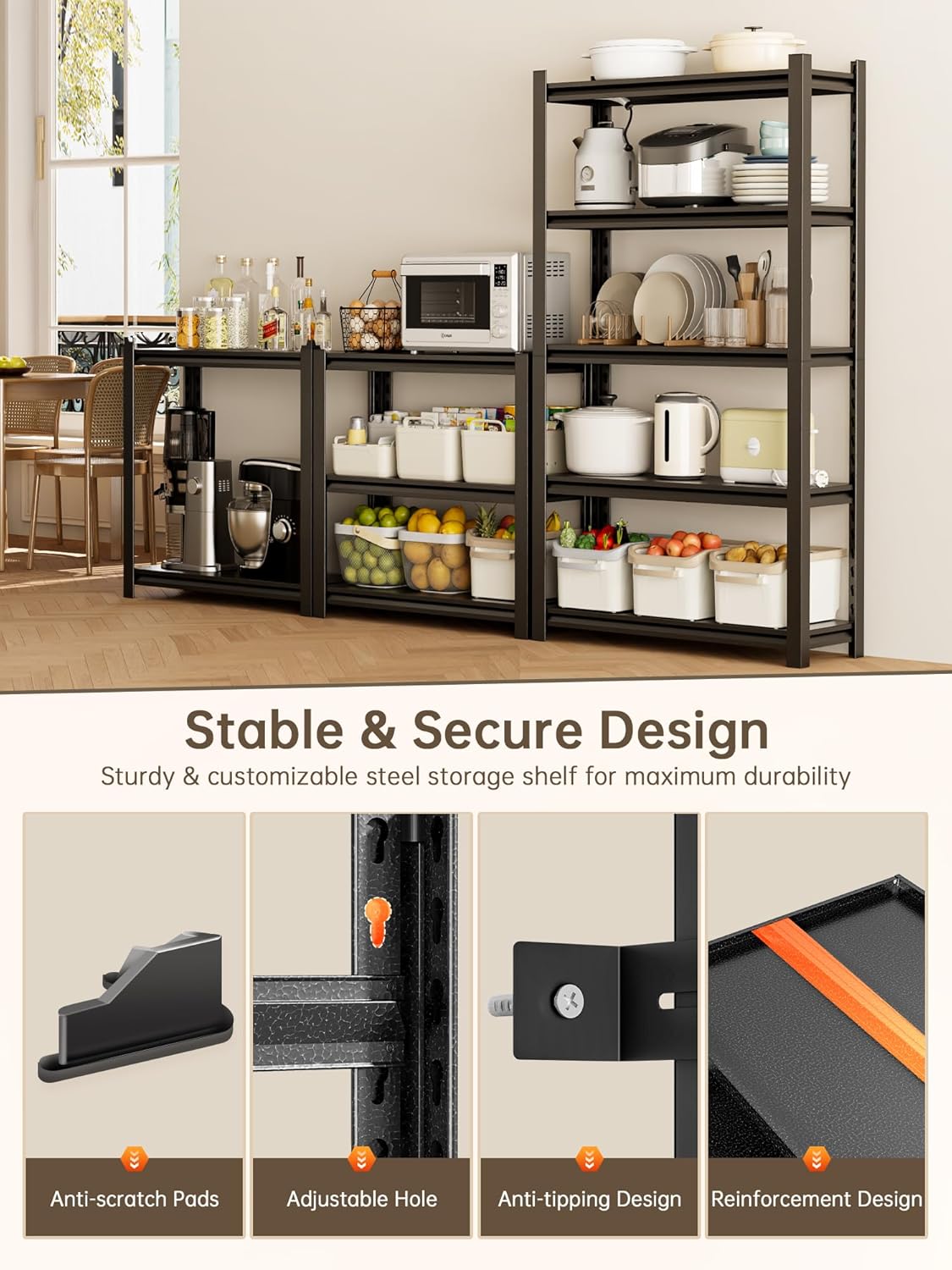 - [Heavy-Duty Steel Shelving for Maximum Durability]Built with industrial-grade steel,these 5-tier metal shelves support up to 500 lbs per shelf, ideal for garage storage,workshop tools,or pantry organization.Resists bending or warping for long-lasting use