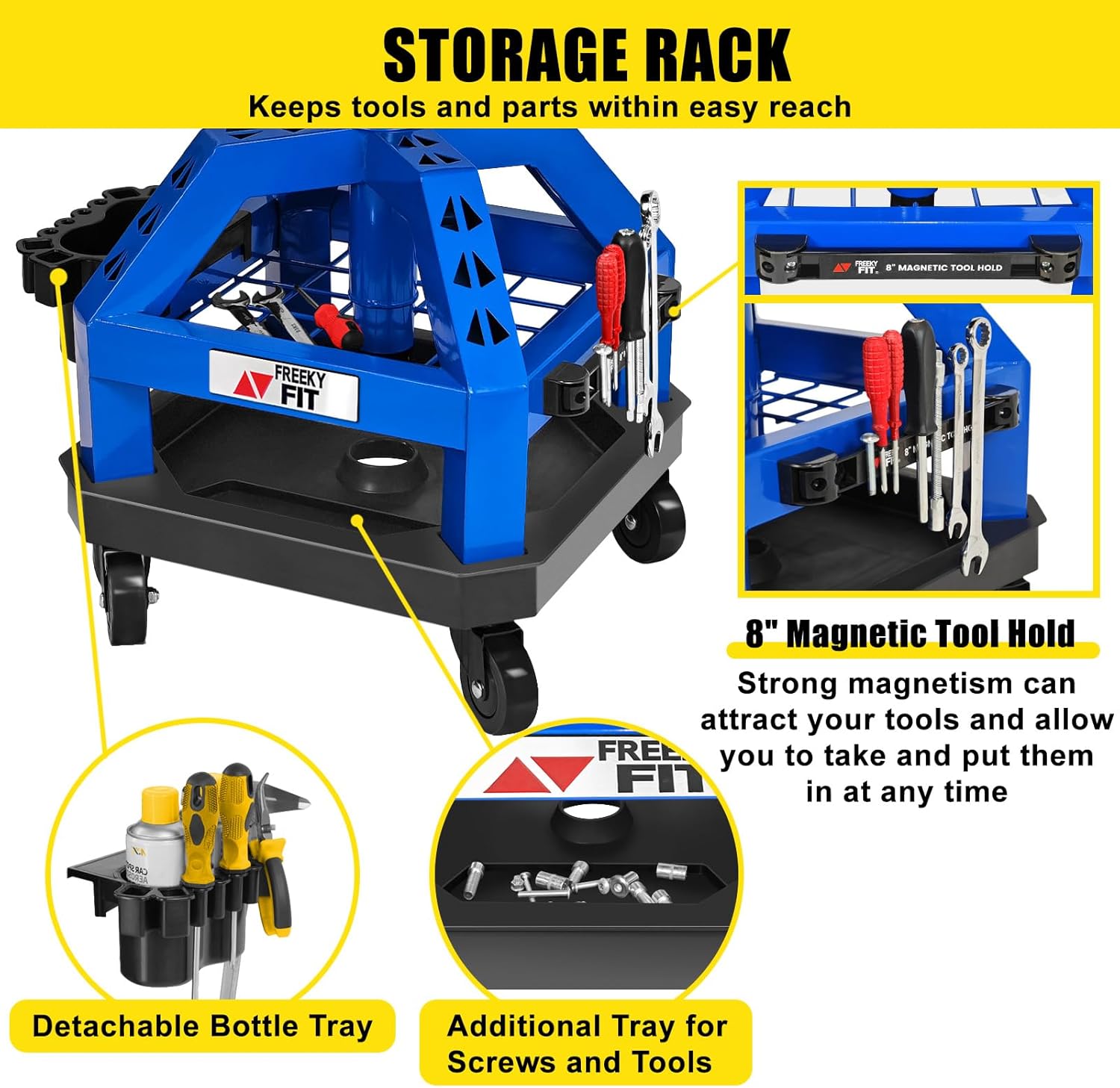 - 8 Inch Magnetic Tool Hold: The adjustable rolling shop stool with backrest for garage owns a special strong magnetic stripe. It can be a handy storage space which can hold the tools expediently