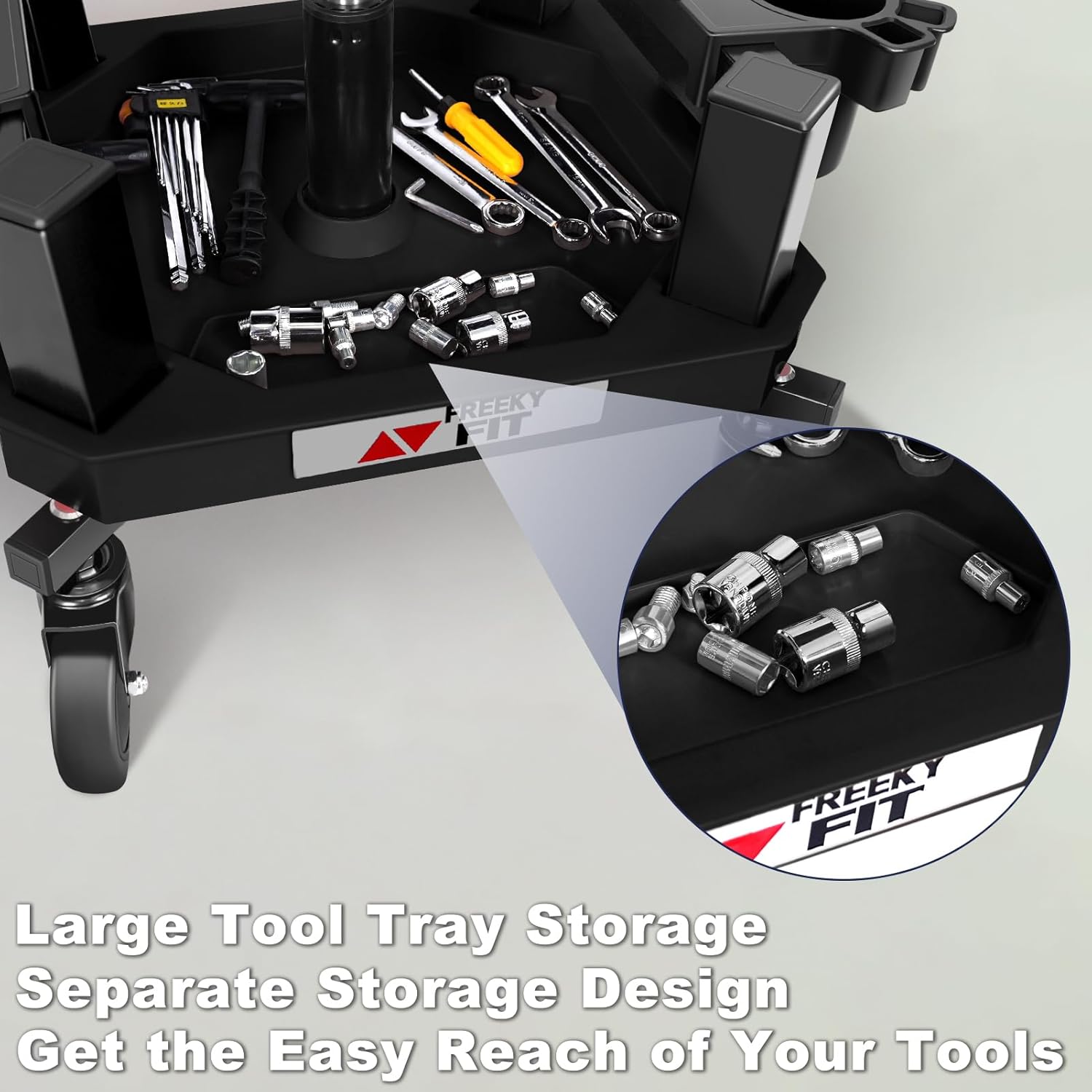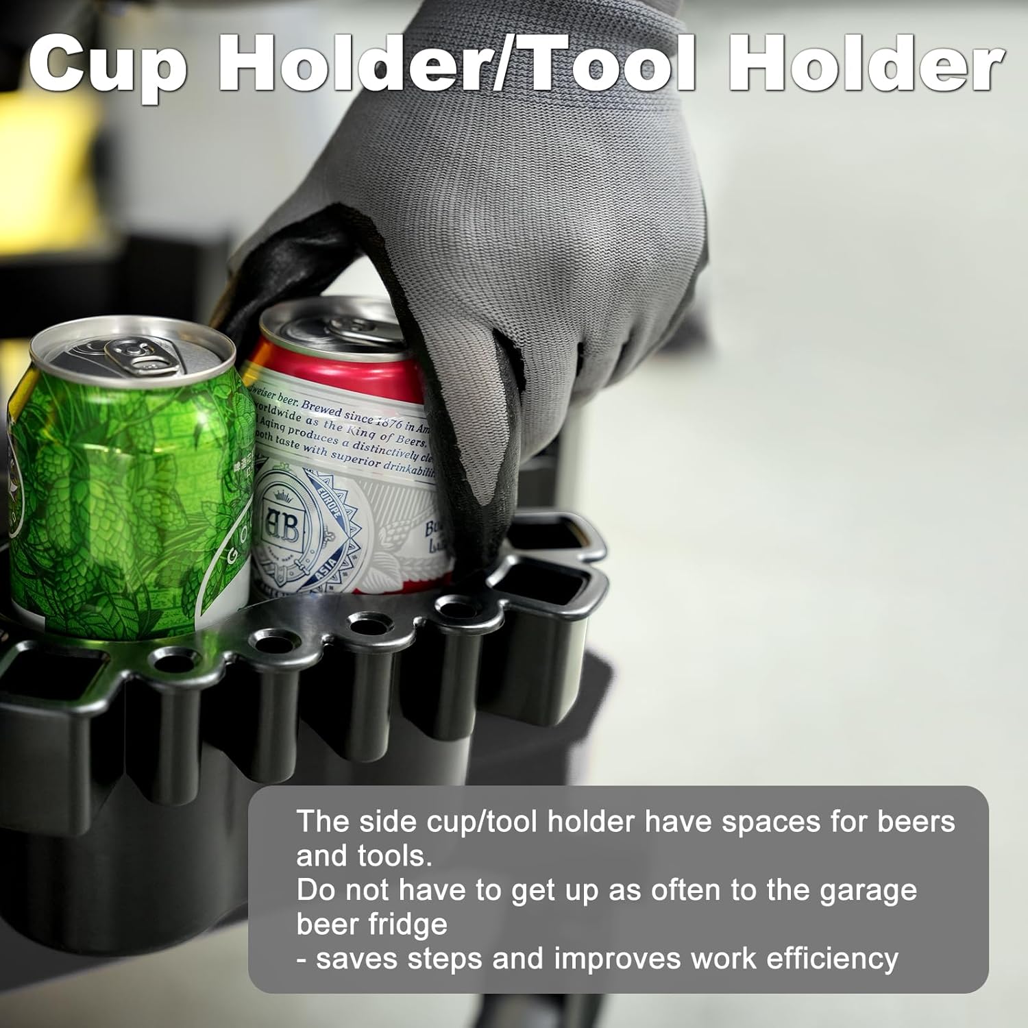 - 【ONE tool tray & TWO cup holders/tool holders】The garage stool has a very good storage function. There is a tool tray and two cup holders/tool holders. At the same time, the tool tray is equipped with a small partition space. You can put small tools like screws here. When you move, do not worry about the screws slipping out of range. It is convenient to store and access necessary tools and parts at anytime