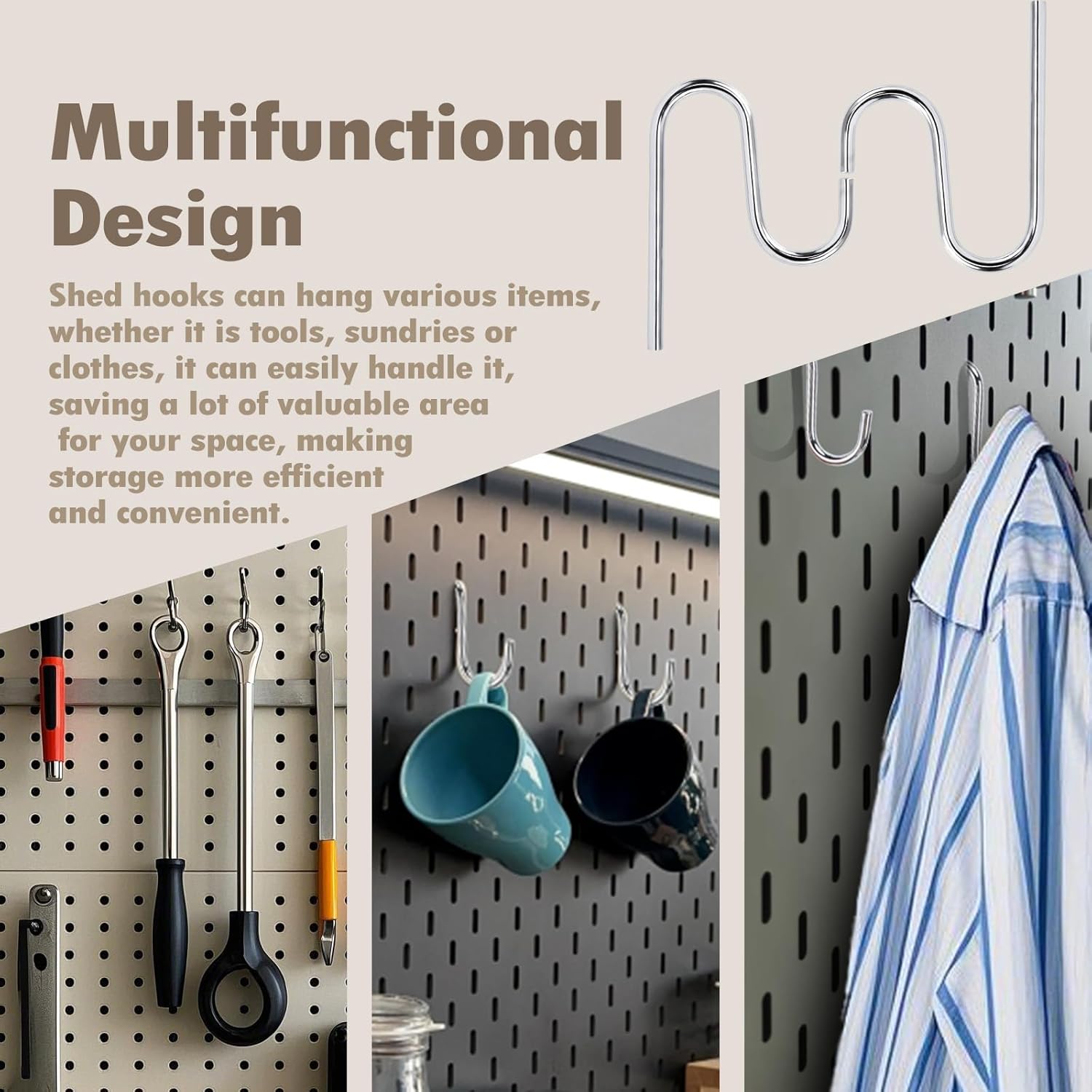 - Multifunctional design: Shed hooks has a variety of practical functions. Shed hooks can be used as a wall hook, storage hook, tool hook, etc. Shed hooks can hang various items, whether it is tools, sundries or clothes, it can easily handle it, saving a lot of valuable area for your space, making storage more efficient and convenient.