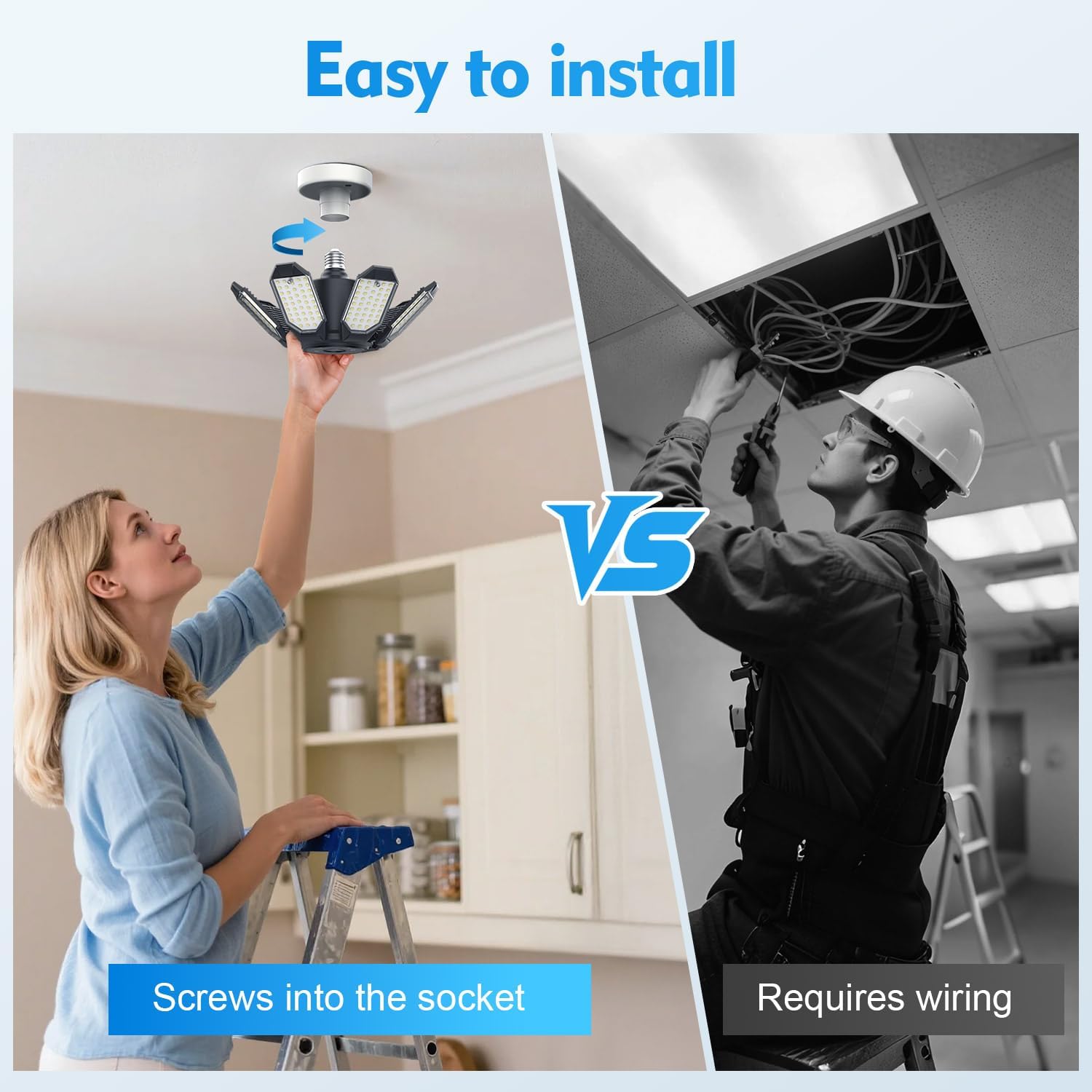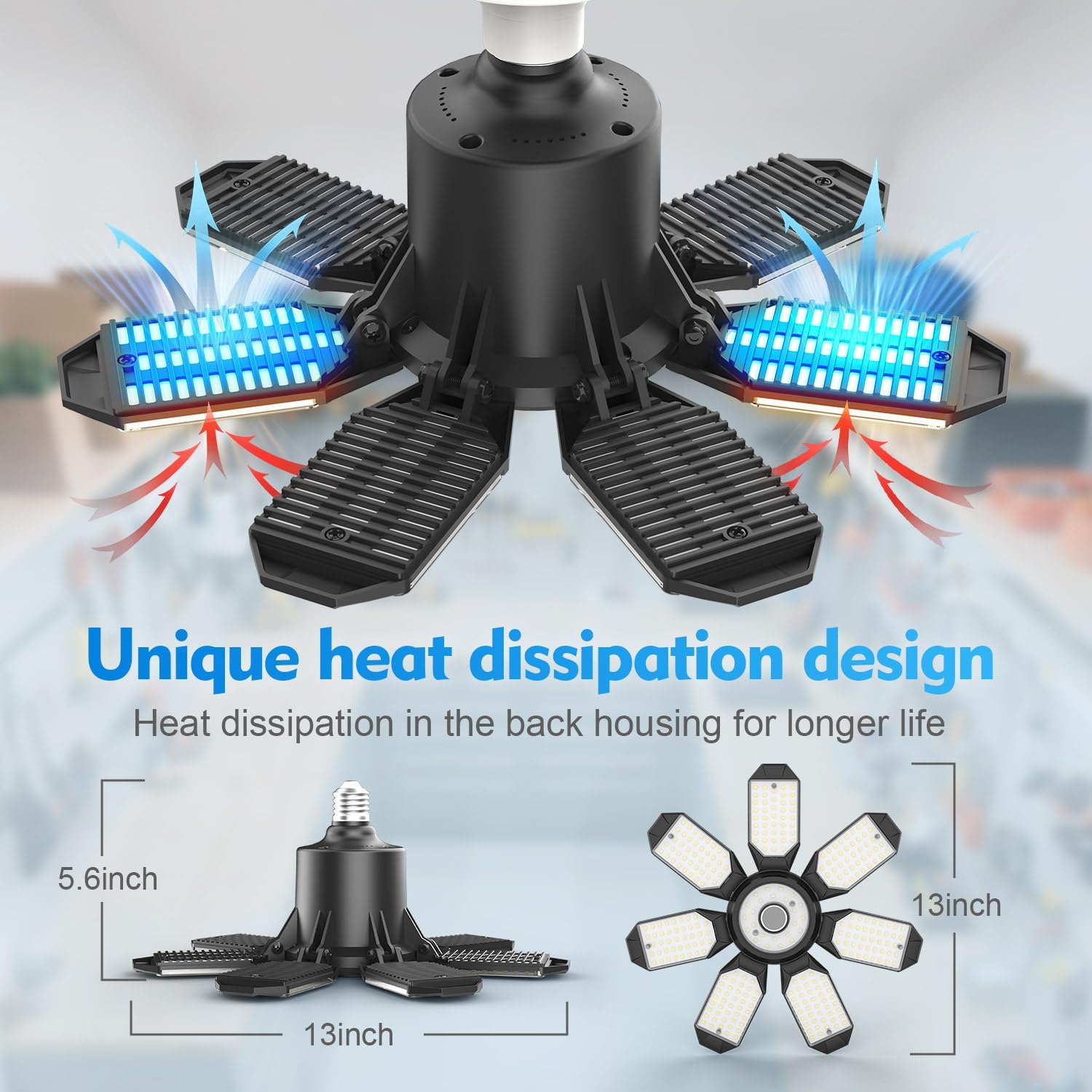 - 【7+1 Deformable Garage Lights】The garage light fixture adopts a 8 panel design, 7 adjustable 0-90°panels + 1 central lighting panel, which is adjustable to illuminate specific areas and achieve 360°all-round lighting coverage, garage lights to light up your life.