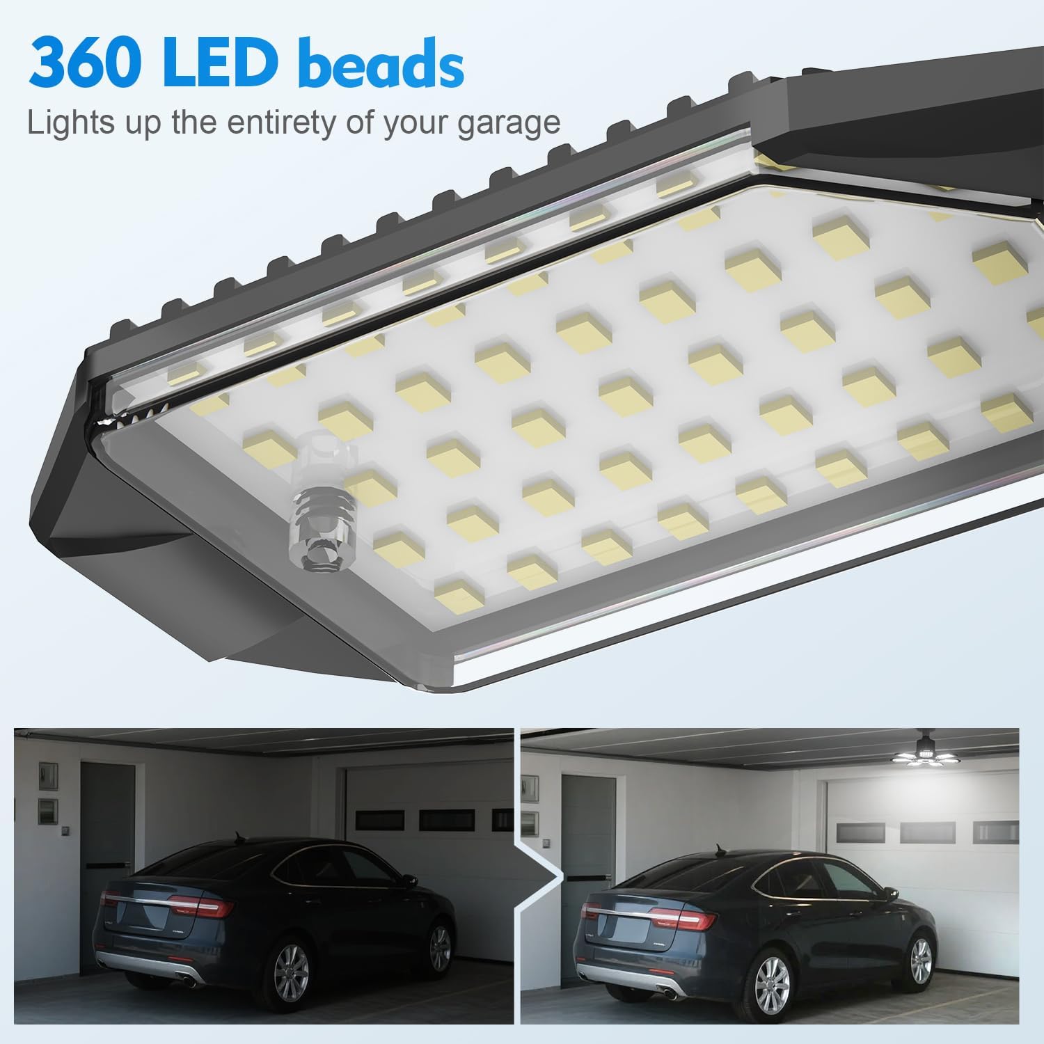- 【2025 LED Garage Lights 】2025 upgraded with new garage lights, with 200high-quality LED chips, garage lights output is 20000 lumens at 65000 K "daylight" for your garage, offering no dark areas, flickering or glare, bringing you a more comfortable Visual lighting experience. Tip: This is not a motion-sensing garage light.