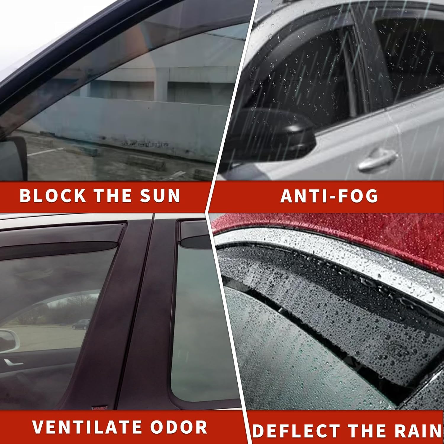- 【Improve Driving Experience】 Allows fresh air to circulate through open windows while keeping the rain out or reduces heat. Reduce mirror and window fogging; reduce sun glare through side window