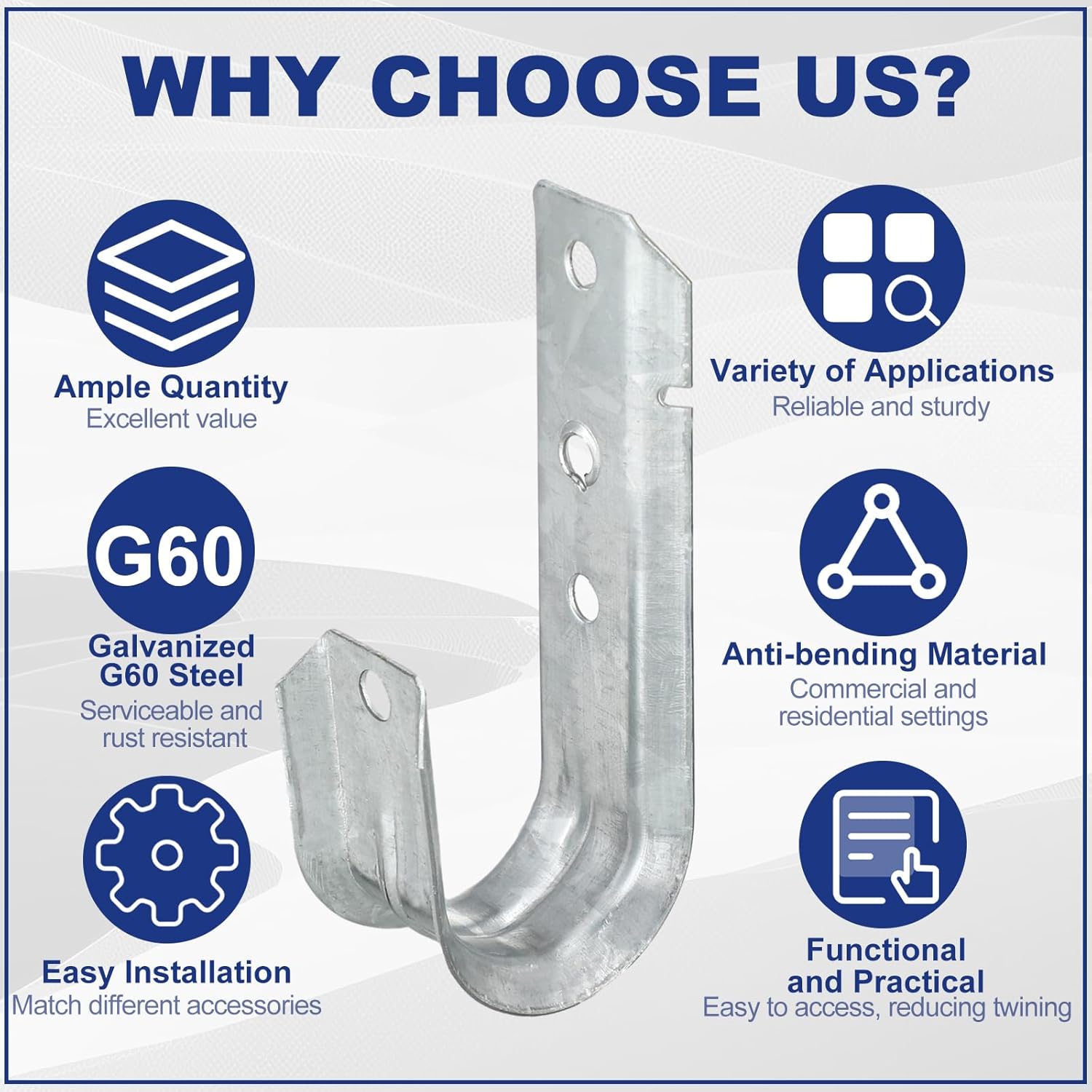 - Robust Material: the j hooks for hanging are constructed from dependable and rust resistant G60 galvanized steel, the heavy duty structure imparts them the ability to withstand regular wear and tear, and these j hooks can hold up to 60 lbs each; The hooks have UL certification, consolidating their reliability and toughness in supporting cables and wires