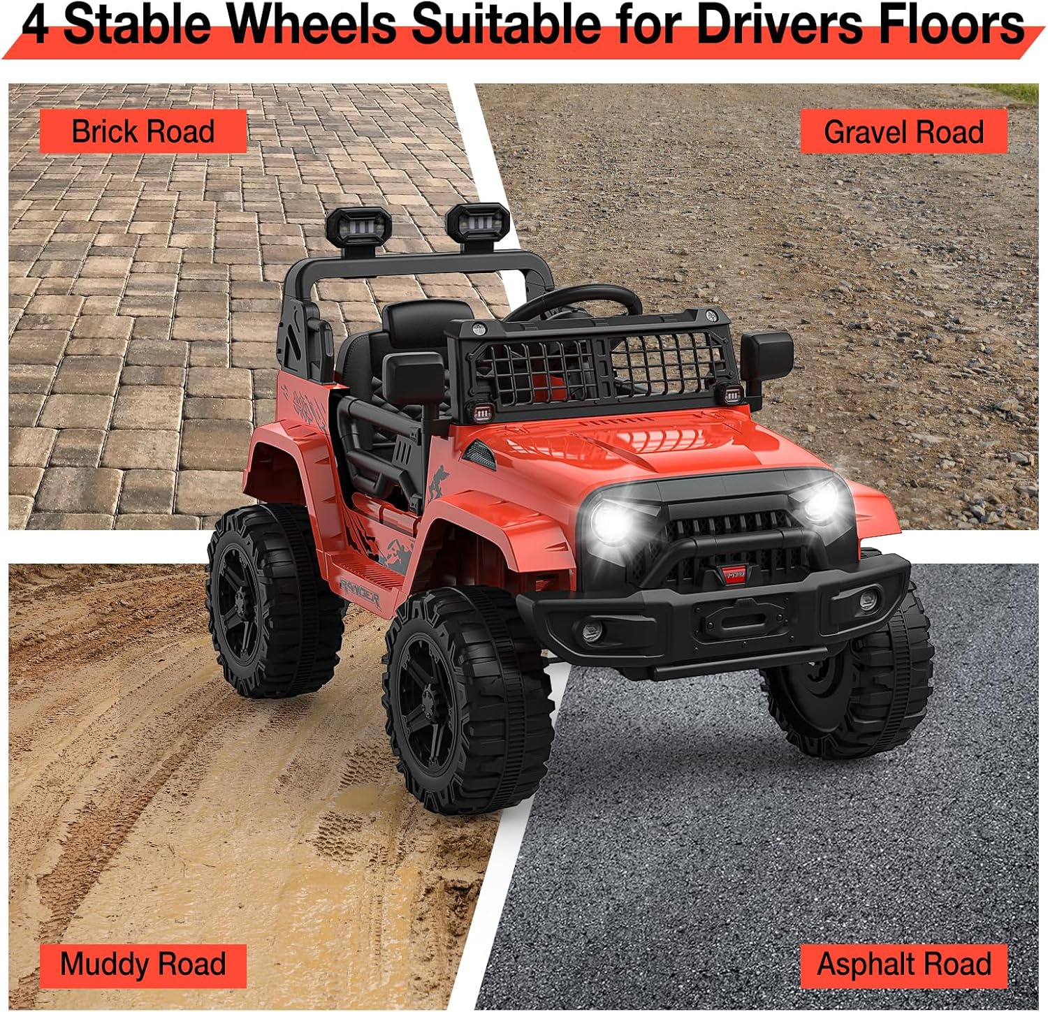 - ā” 12V Power & All-Terrain Performance: High-torque 12V motor with puncture-proof tires conquers grass/concrete/driveways. LED headlights ensure nighttime visibility.